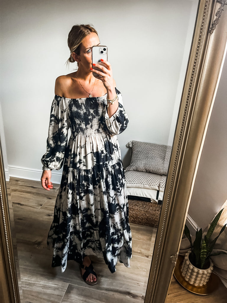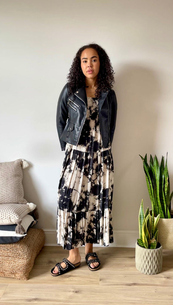 Leather Jacket + Maxi Dress + Sandals