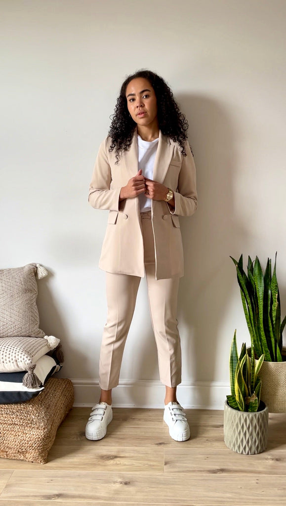 This look blends formal and casual elements for a stylish and comfortable look that's suitable for dressy occasions or everyday wear. The suit offers a polished appearance, while the t-shirt and trainers add a relaxed and trendy touch.