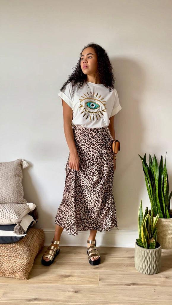 This outfit is a comfortable and stylish option for the changing weather. The t-shirt provides breathability and can be layered for cooler days, while the maxi skirt offers coverage and a feminine touch. The sandals are a practical choice for warmer days.
