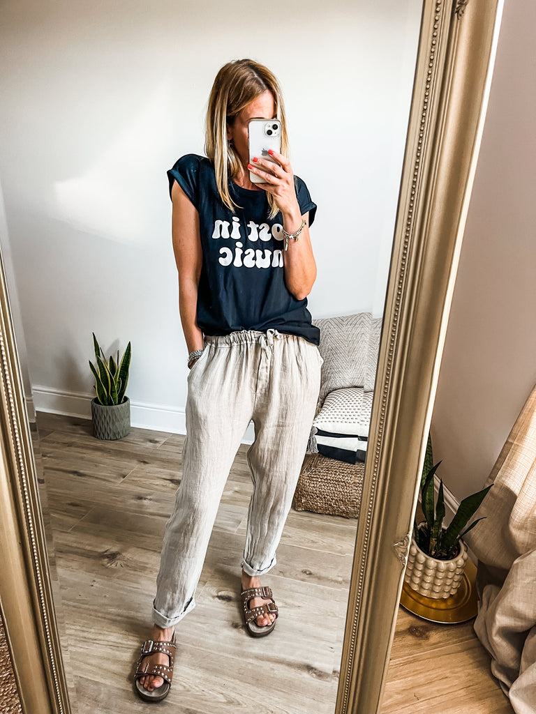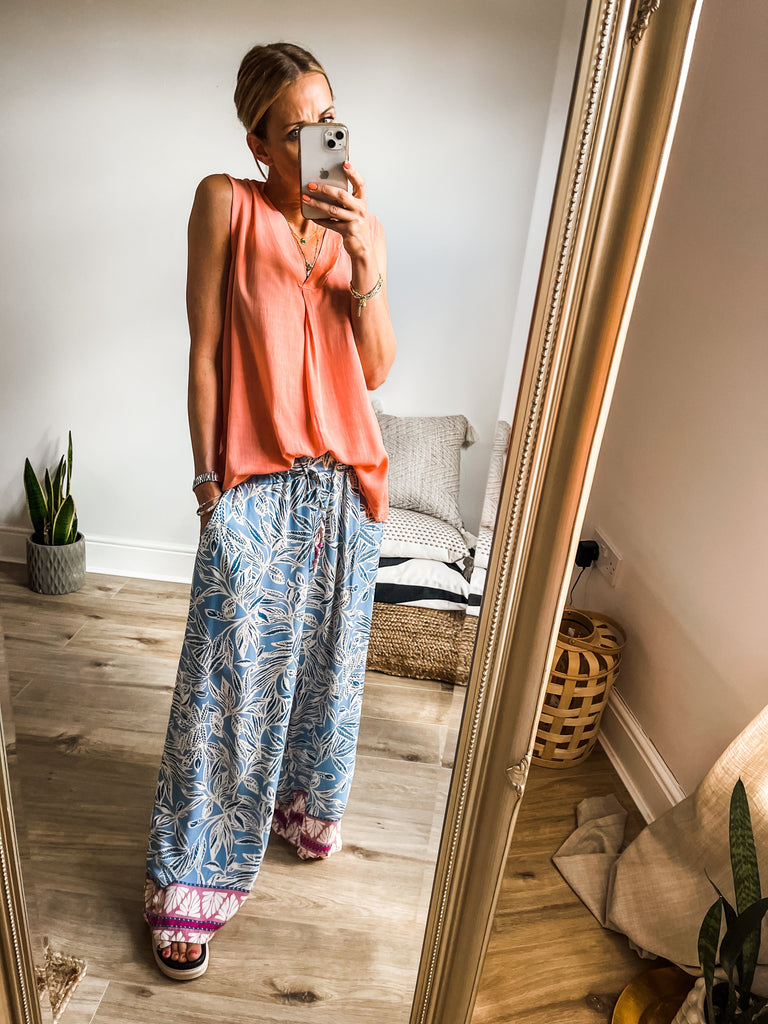 Embrace the breezy elegance of palazzo pants for a stylish yet comfortable outfit. Opt for lightweight fabrics like chiffon or cotton for maximum comfort in the summer heat. Pair with a fitted or loose-fitting tee, tucked in or knotted at the waist for a relaxed and feminine look. Complete the ensemble with strappy sandals or your favourite trainers.