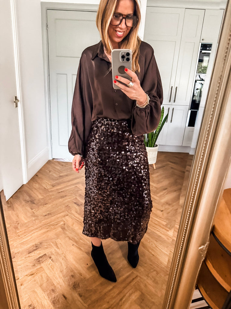The combo of a sweatshirt, crossbody bag and runner trainers keeps this look cool and causal. Create a head-to-toe sequin look by pairing this skirt with the matching top.
