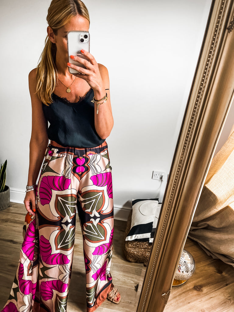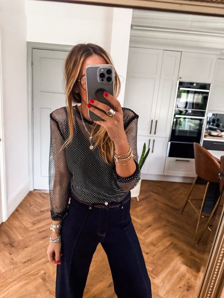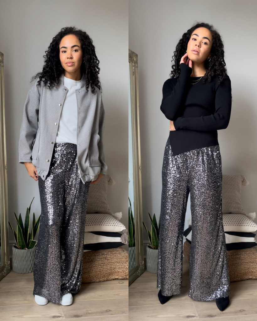 Start the day wearing these fabulous sequin trousers with a simple tee, oversized bomber jacket and trainers, before switching them for a fitted black top and pointed heeled boots.