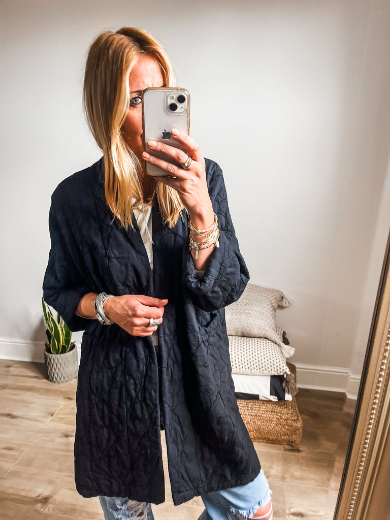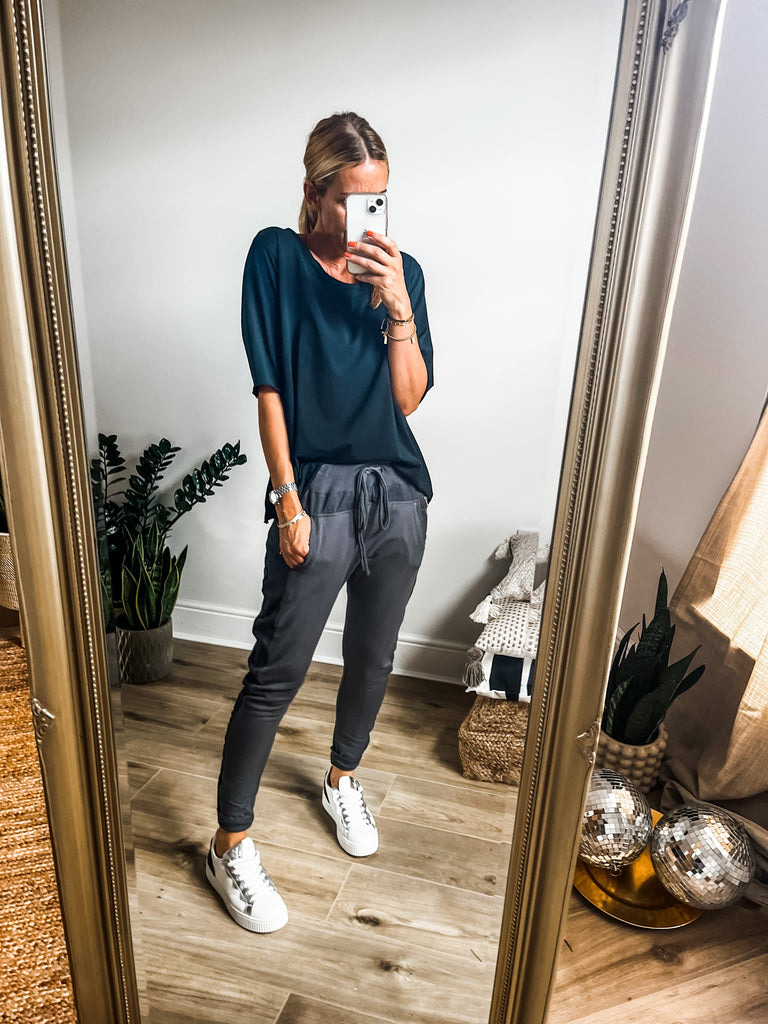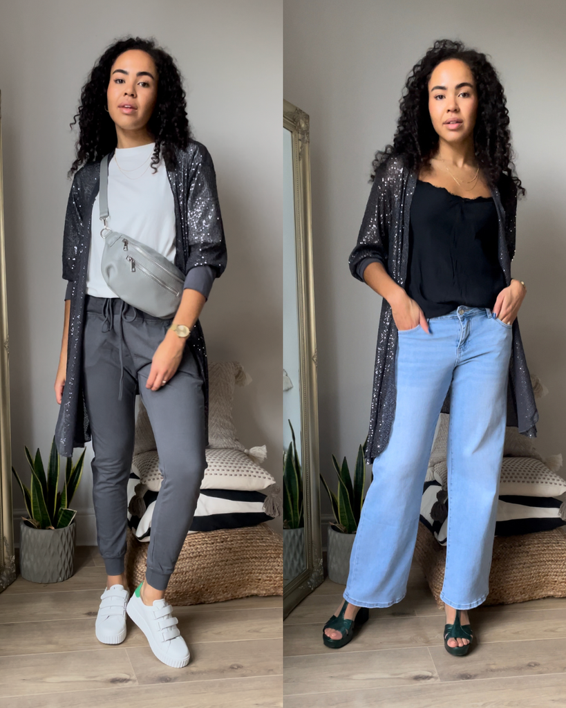The tonal styling of the causal joggers and sequin cardigan elevates a daytime outfit. Into the evening you can’t go wrong with jeans and a nice top finished with some killer heels.