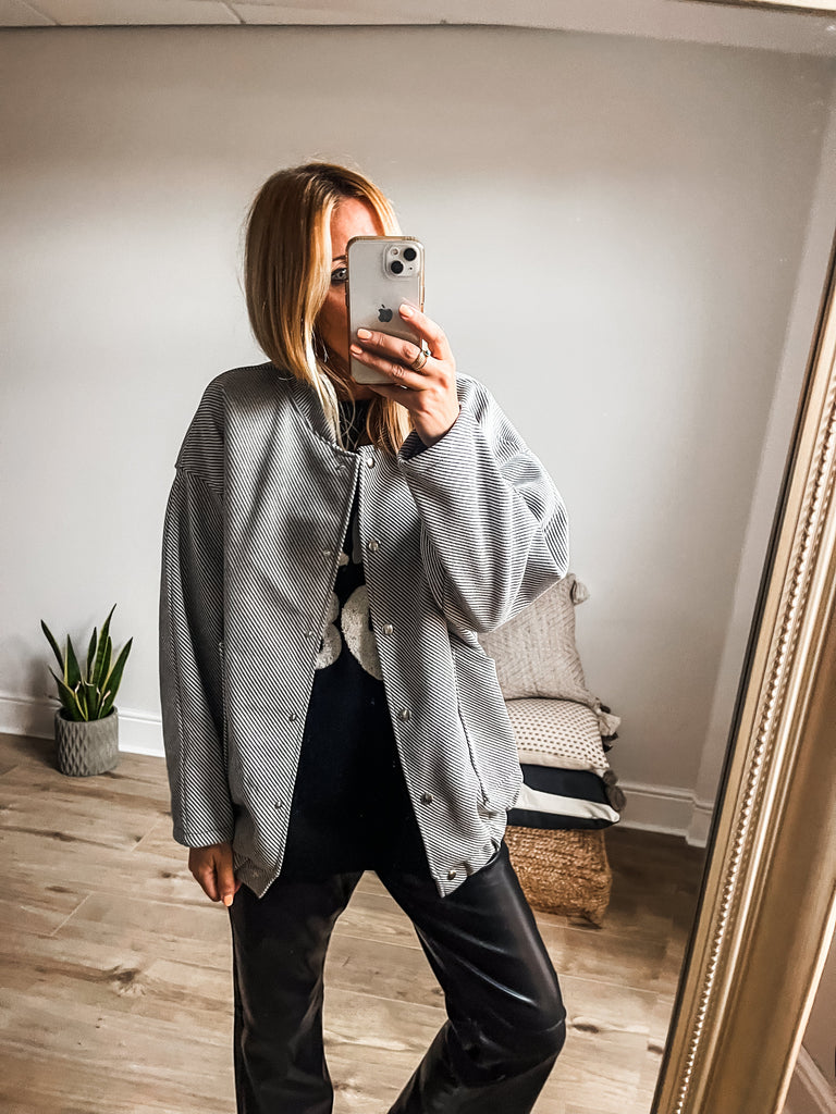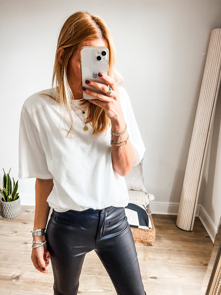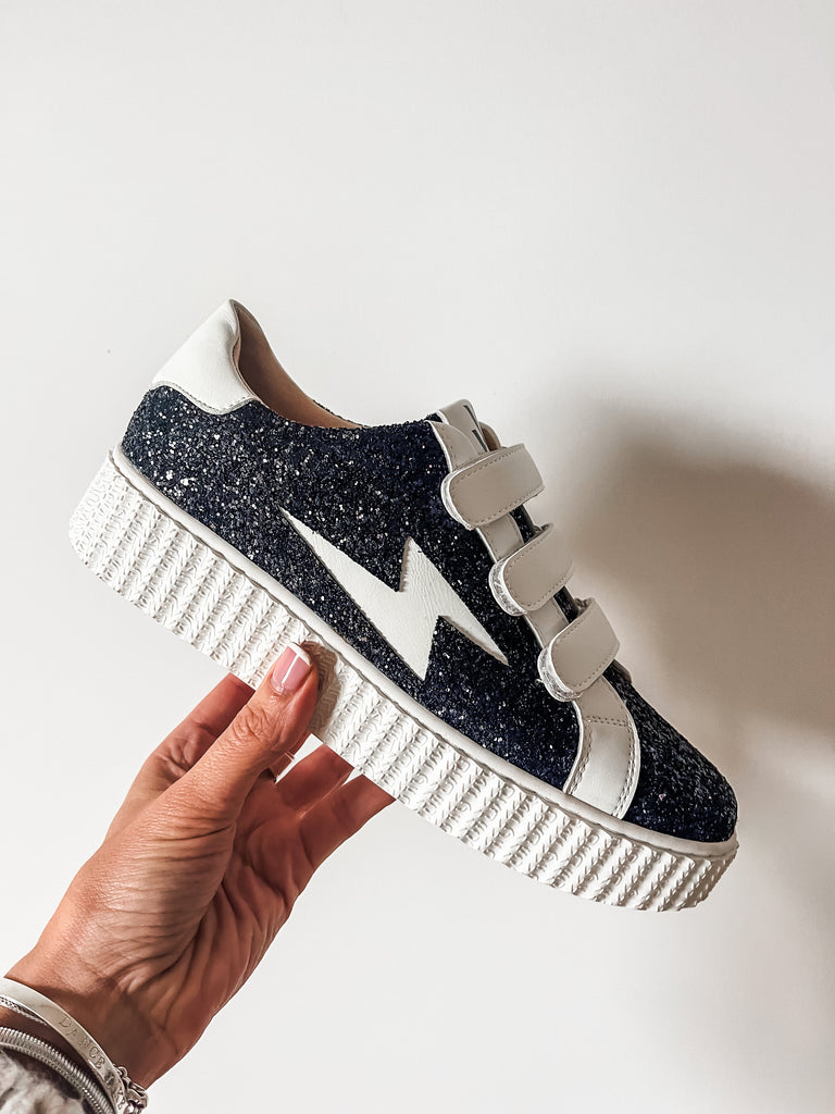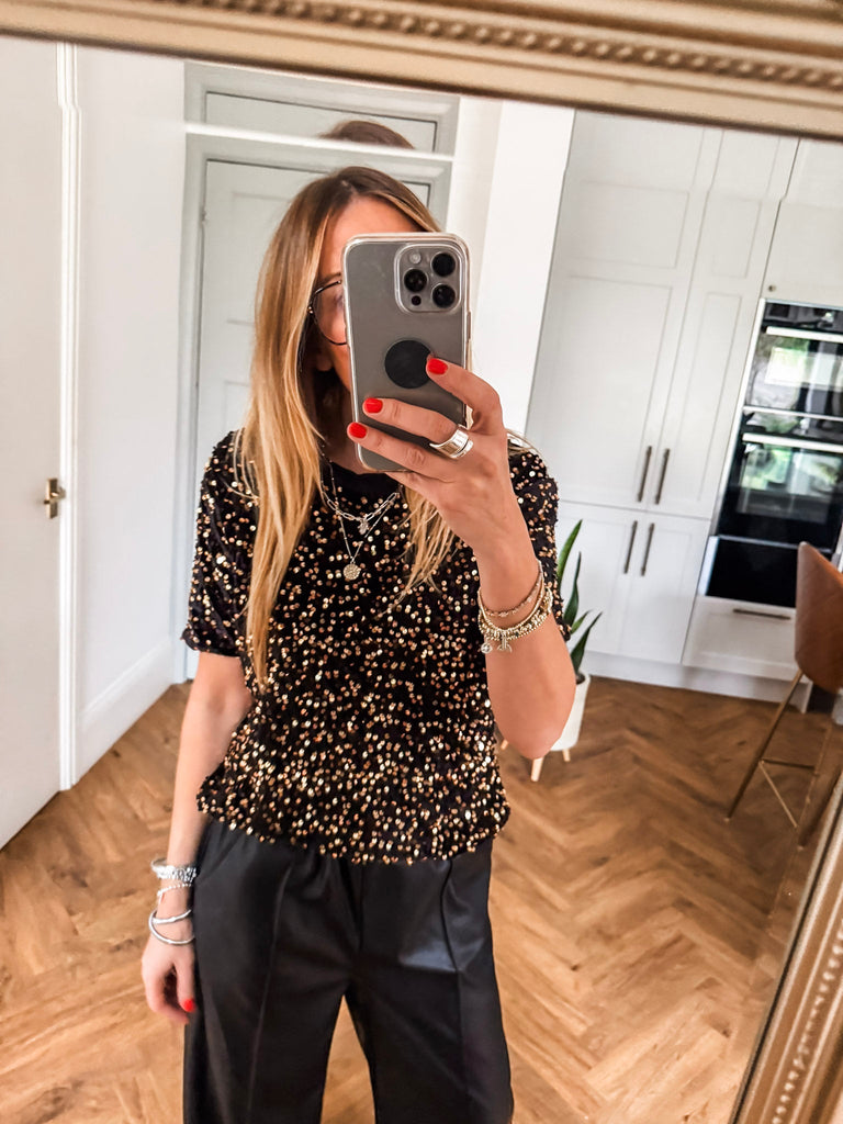 The black jacket tones down the sparkly sequins with the trainers keeping things casual for this daytime look. Then slip into some faux leather trousers for an elevated evening outfit.