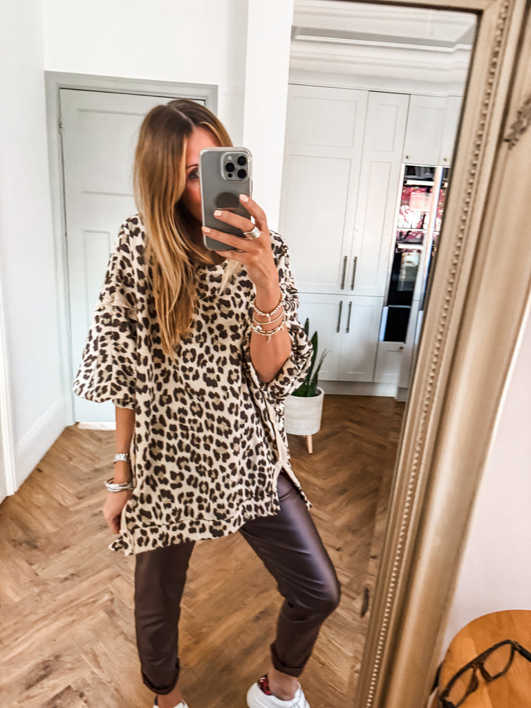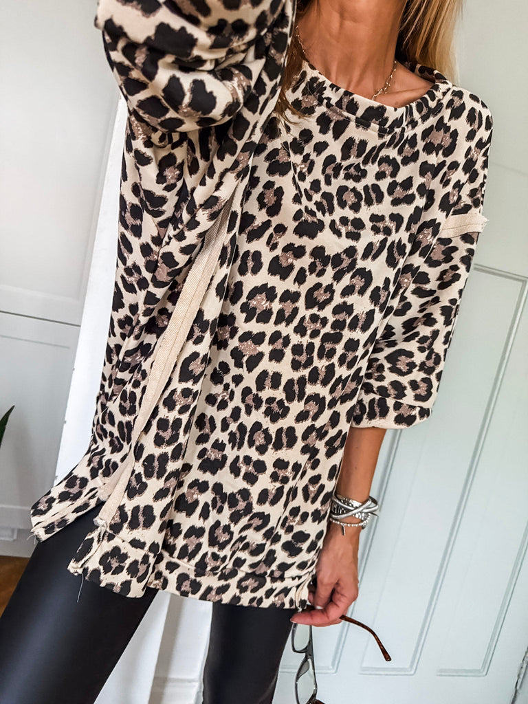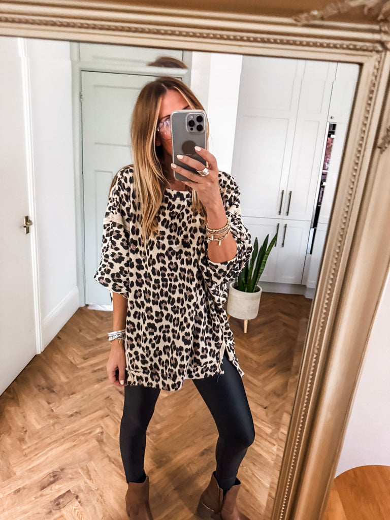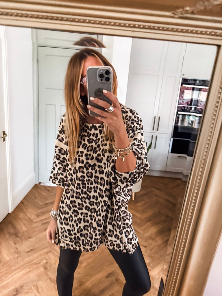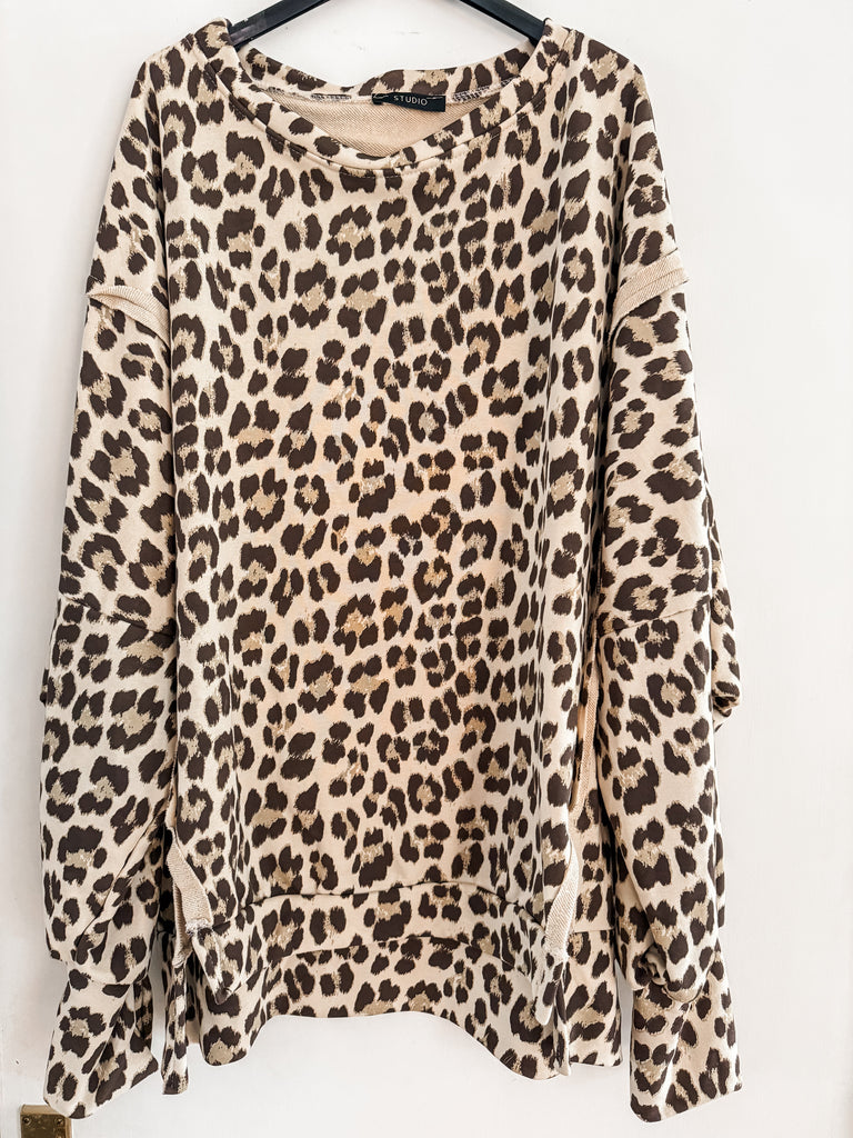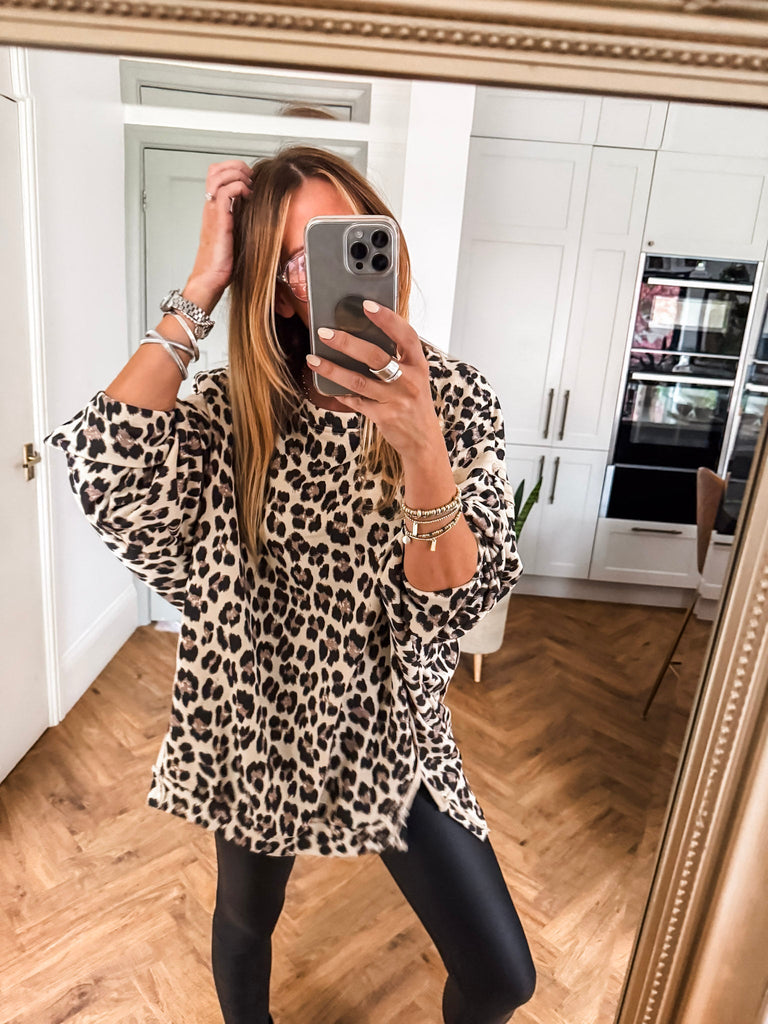 Stay effortlessly stylish in our Leopard Print Sweat Tunic. Its loose fit and long sleeves offer all-day comfort, while the edgy leopard print elevates any outfit. Upgrade your wardrobe with this versatile essential for a laid-back yet trendy look!