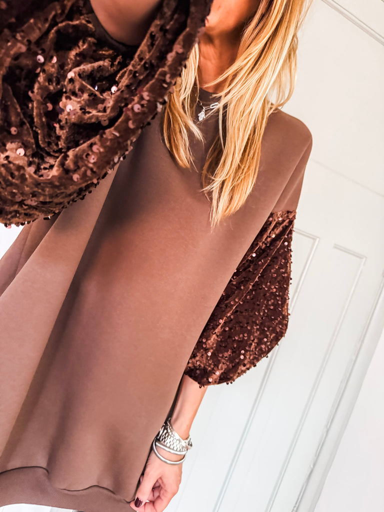 We love how this sweatshirt delivers both comfort and confidence in one effortless piece. The soft fabric feels like a hug, while the sequin sleeves bring instant glamour. It’s your go-to for days when you want to feel relaxed yet unmistakably stylish.