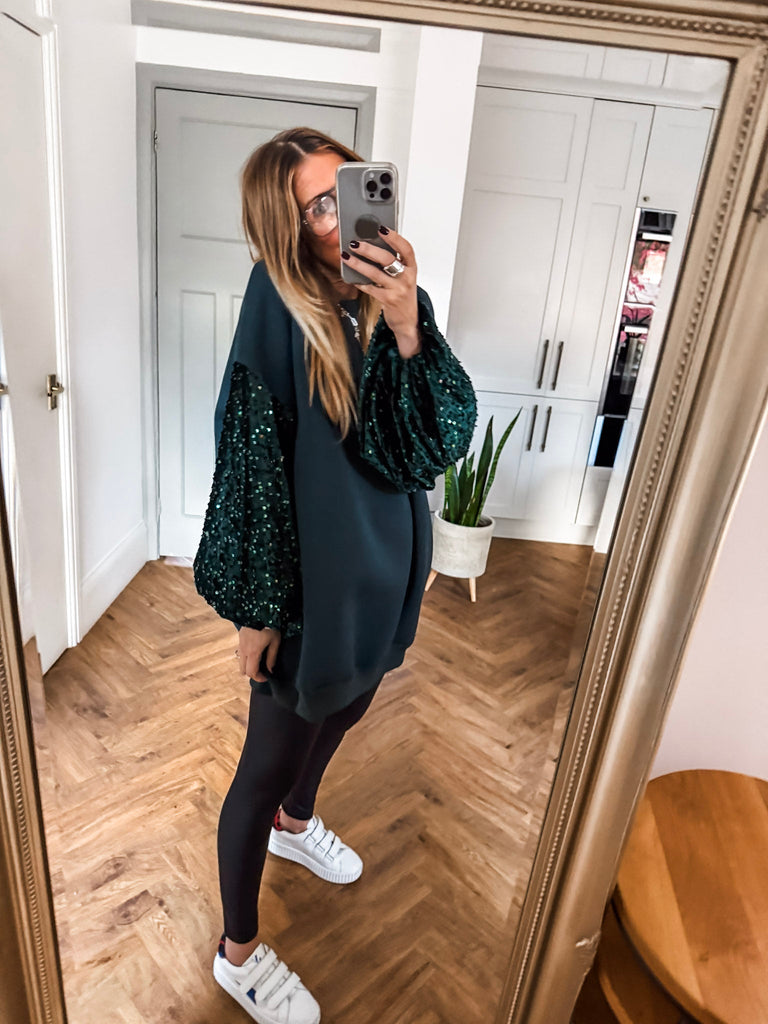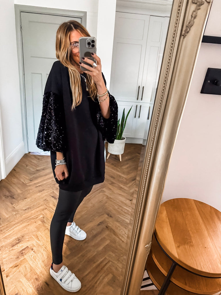 Style it with sleek leggings or leather pants for a chic off-duty look. Add chunky sneakers for day or swap in heeled boots to take it night-out ready. Finish with bold accessories to let the sequin sleeves shine.