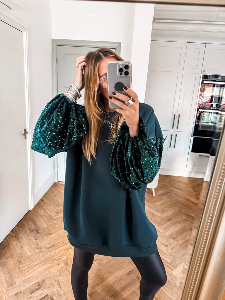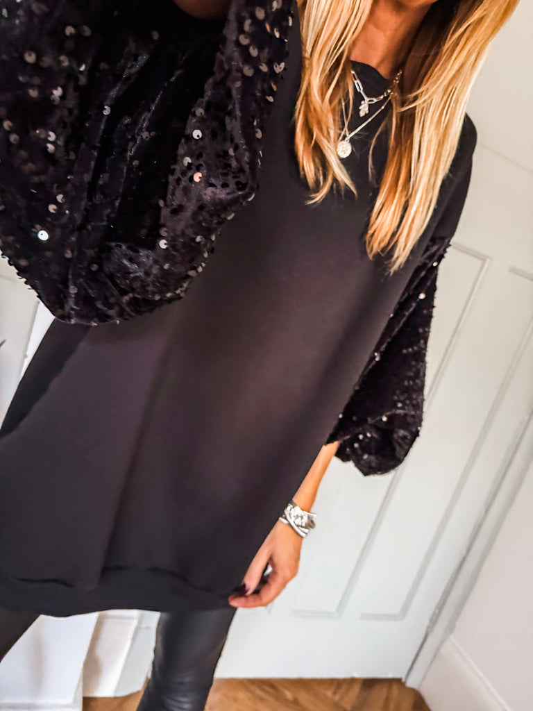Turn heads in this oversized tunic sweatshirt—where laid-back comfort meets statement sparkle. Crafted from soft sweat fabric with sequin-detailed sleeves, it’s the perfect blend of cosy and bold. Effortlessly cool, whether worn solo or layered for impact.