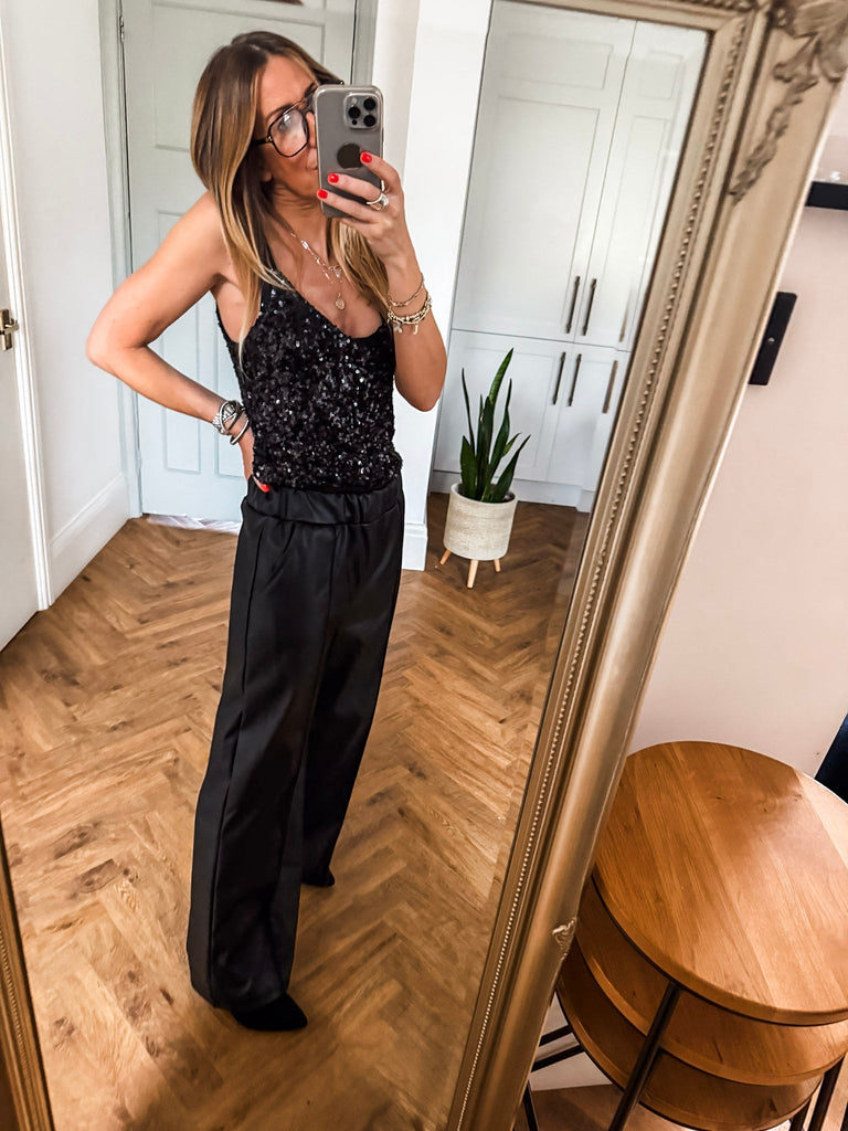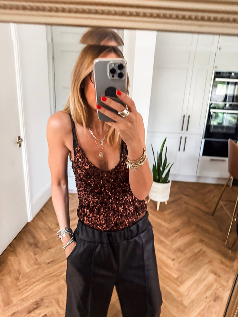 Designed with a flattering v-neck, adjustable straps and embellished with sequins. This is perfect styled with jeans, tailored trousers and skirts for the party season. Fabric is stretchy and will fit up to a size 14.