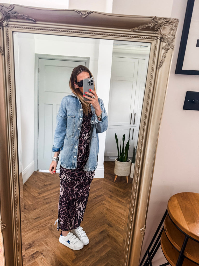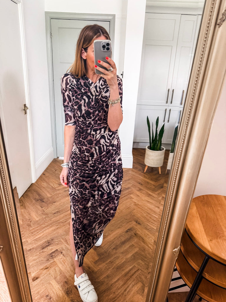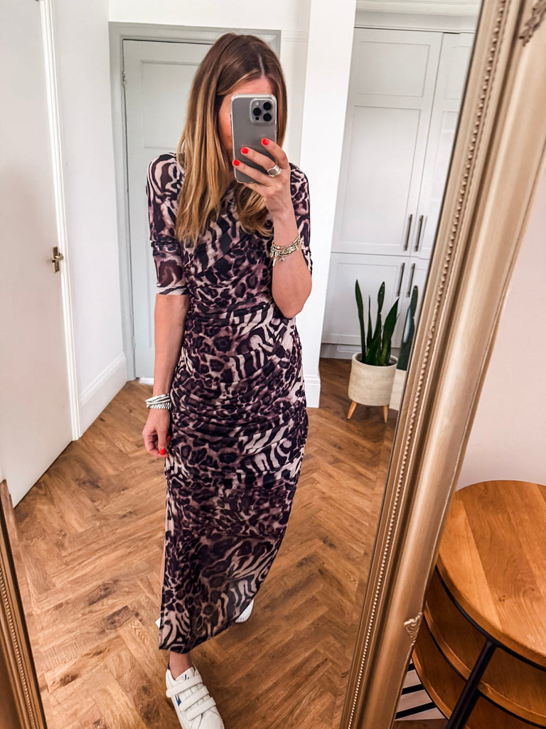 This is going to be a favourite!!!! Make a bold statement in our Mesh Leopard Dress, featuring a fierce leopard print and flattering ruched middle. The long sleeves and mesh fabric keep you cool while adding an edgy, yet chic touch. A must-have piece for anyone ready to stand out in style.
