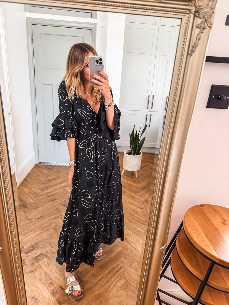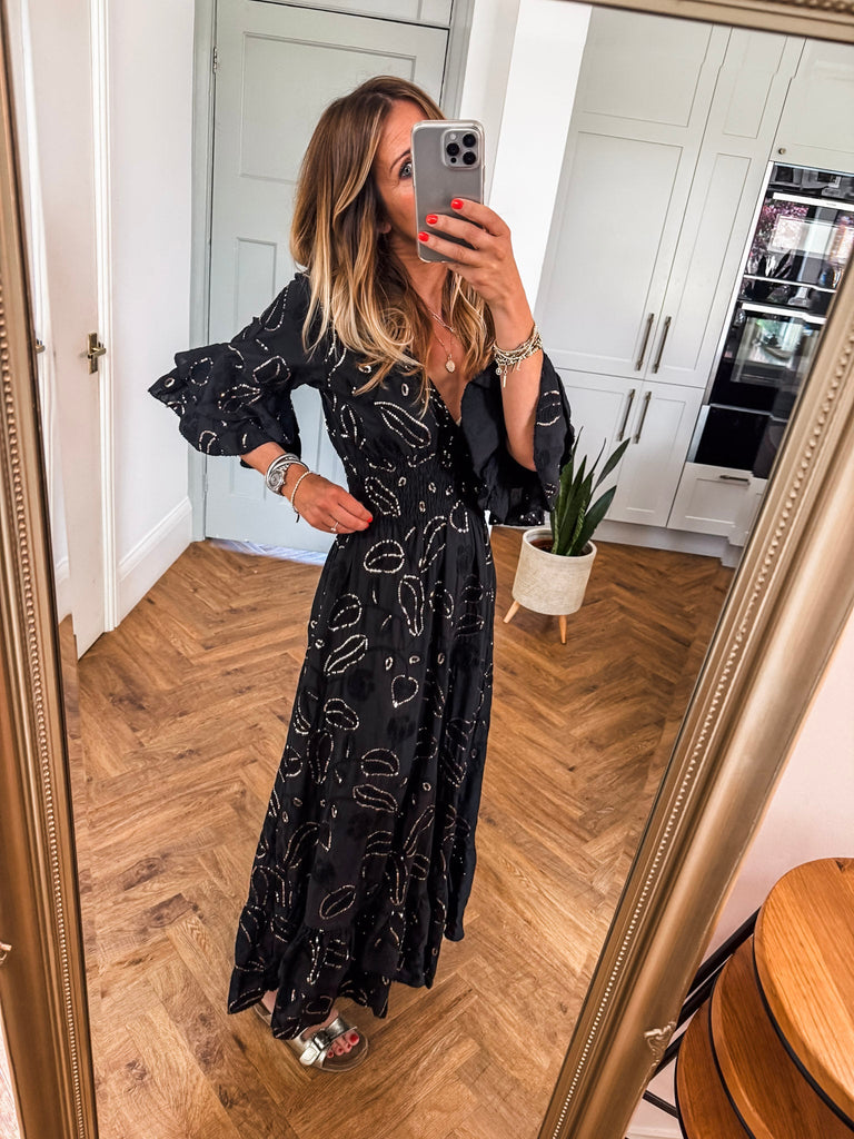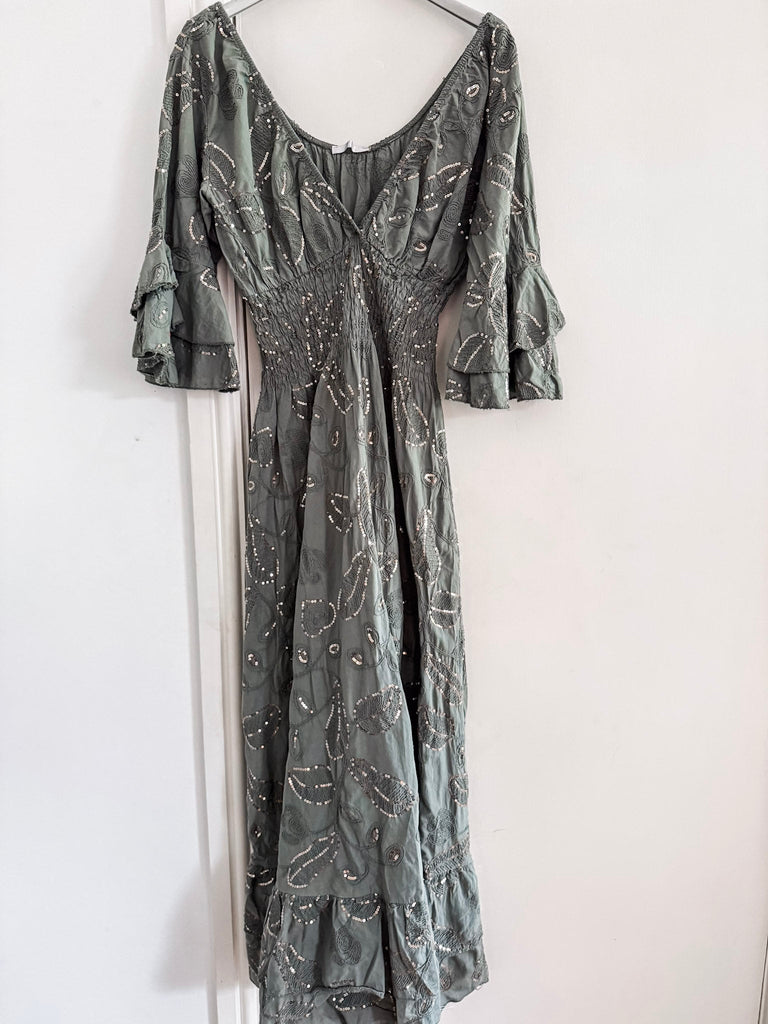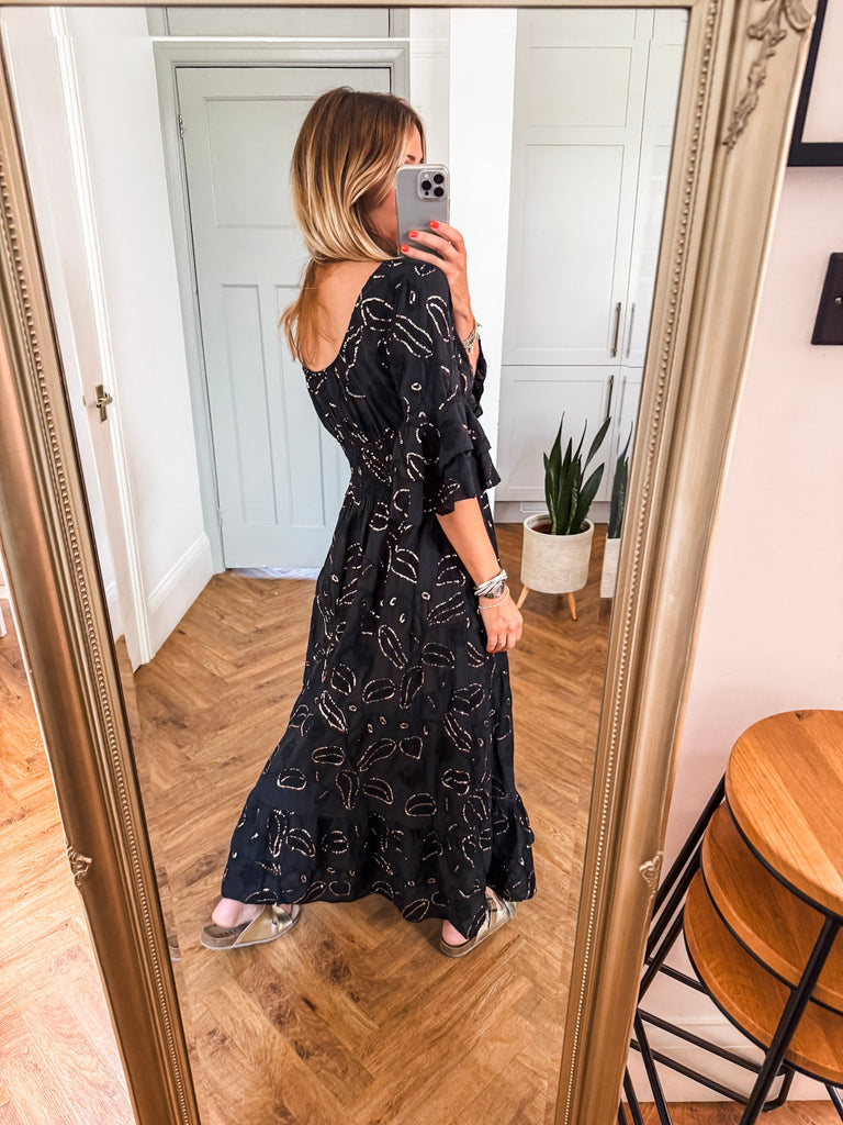 Effortlessly feminine and designed to captivate, this Sequin & Broderie Maxi Dress features intricate detailing and a flattering silhouette. A soft V-neckline and low scoop back add a touch of allure, while the ¾ length sleeves offer graceful coverage. The shirred waistband defines the waist, flowing into a floor-sweeping skirt adorned with delicate sequins and broderie accents—perfect for evenings out or elevated daytime events.