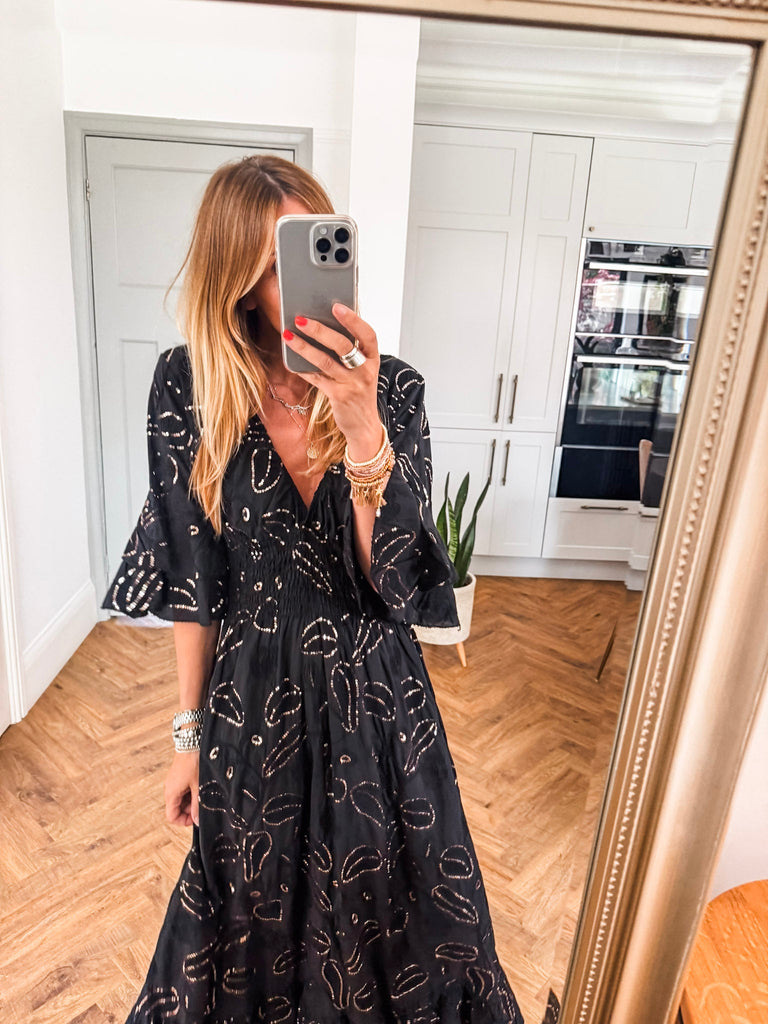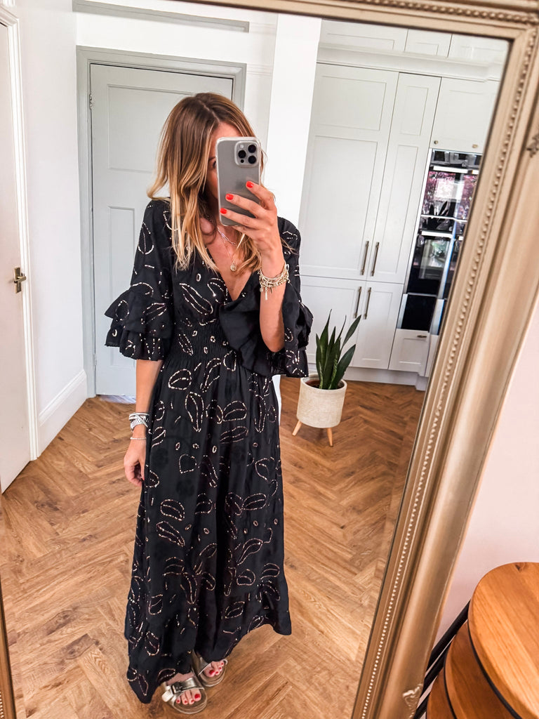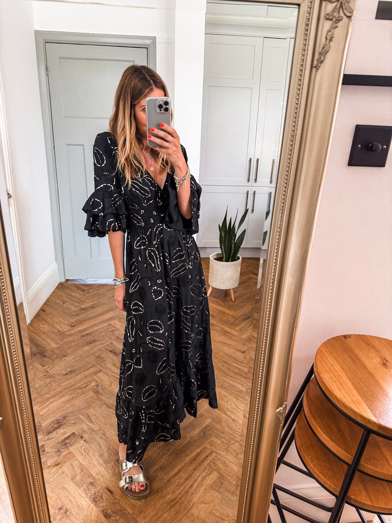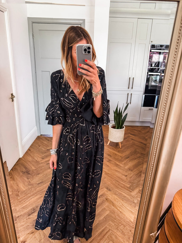 Effortlessly feminine and designed to captivate, this Sequin & Broderie Maxi Dress features intricate detailing and a flattering silhouette. A soft V-neckline and low scoop back add a touch of allure, while the ¾ length sleeves offer graceful coverage. The shirred waistband defines the waist, flowing into a floor-sweeping skirt adorned with delicate sequins and broderie accents—perfect for evenings out or elevated daytime events.