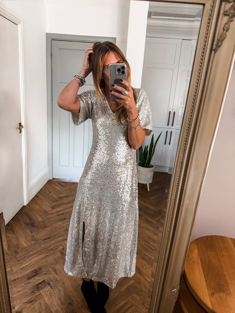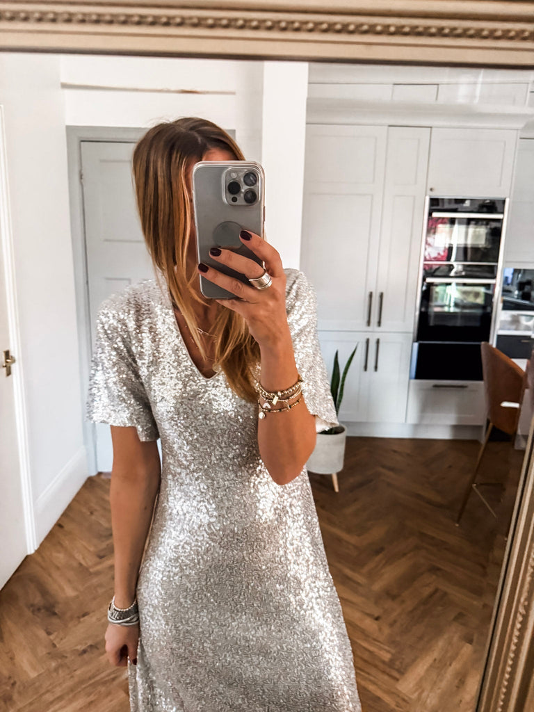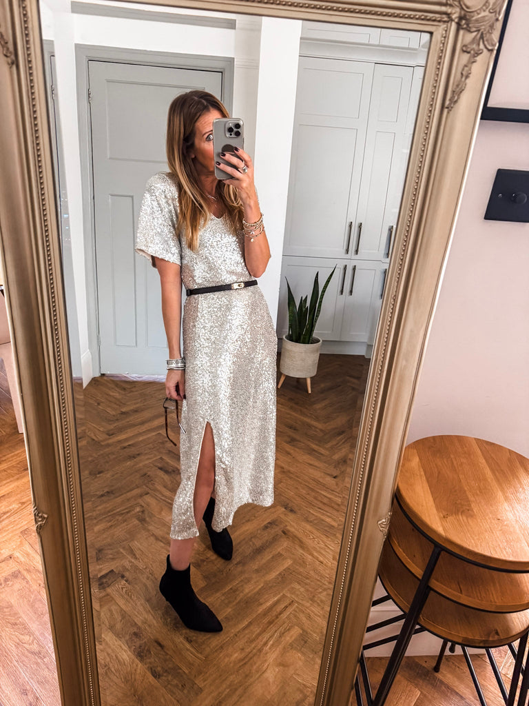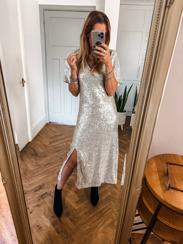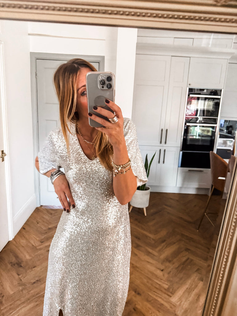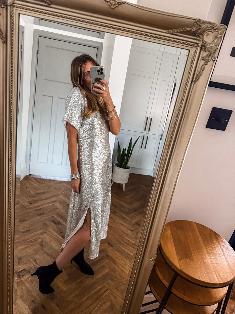 Pair it with strappy heels and delicate jewellery for an effortlessly glamorous look. Add a clutch and soft waves to keep the focus on the dress’s shimmer. For cooler evenings, layer with a tailored blazer for chic sophistication.