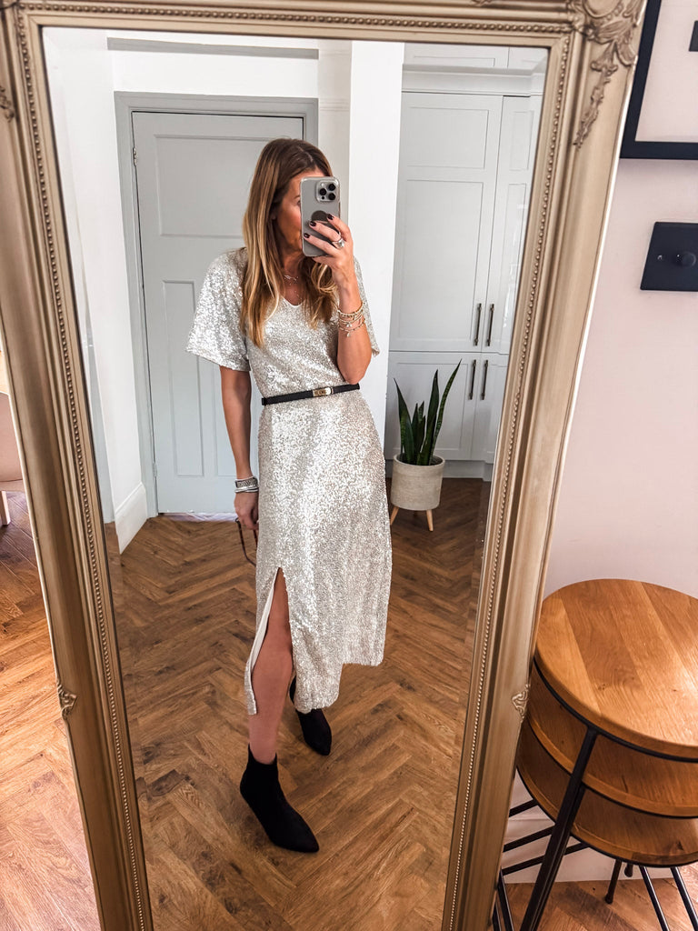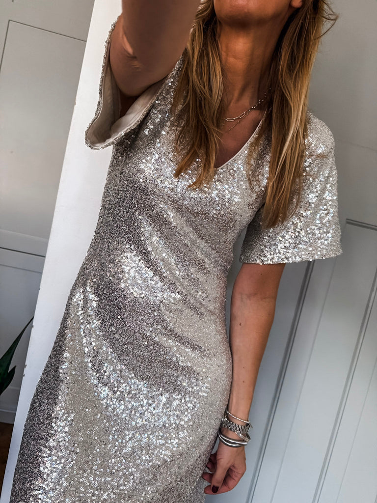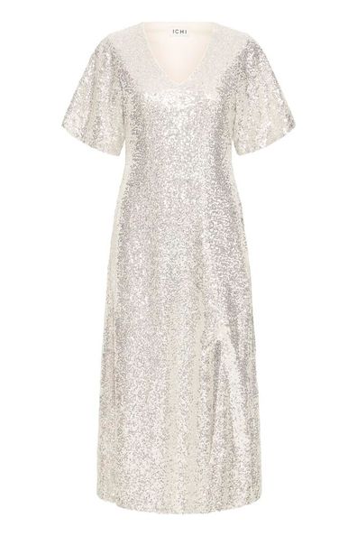Shine effortlessly in the ICHI Fauca Dress, where subtle elegance meets statement sparkle. With a flattering V-neckline, cap flare sleeves, and a sleek side split, it’s designed to move beautifully with you. The perfect choice for making an entrance with effortless confidence. Style this with a belt and heels!