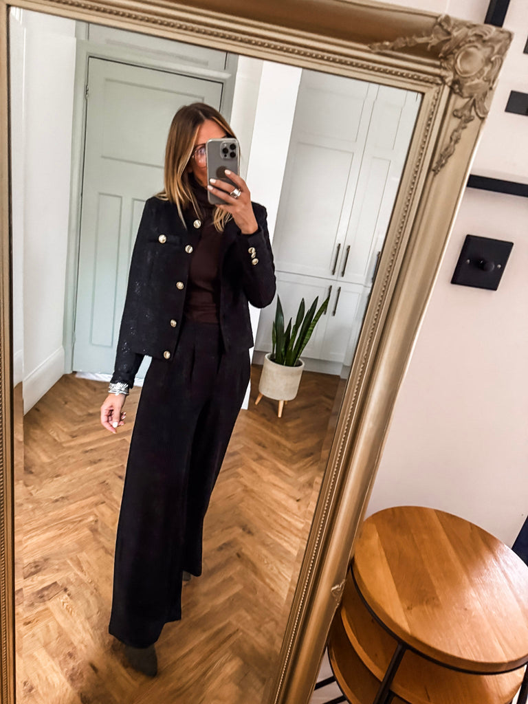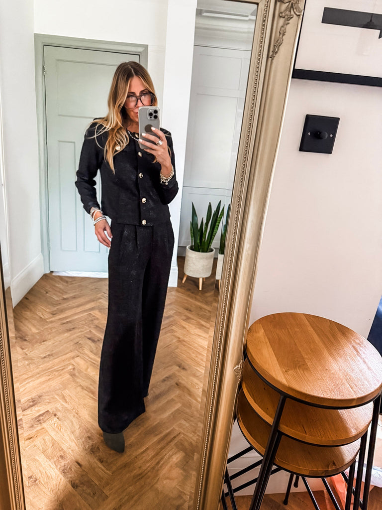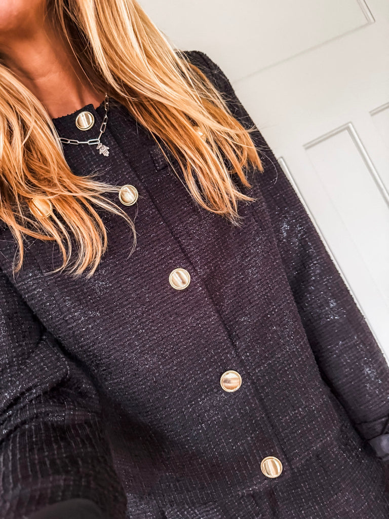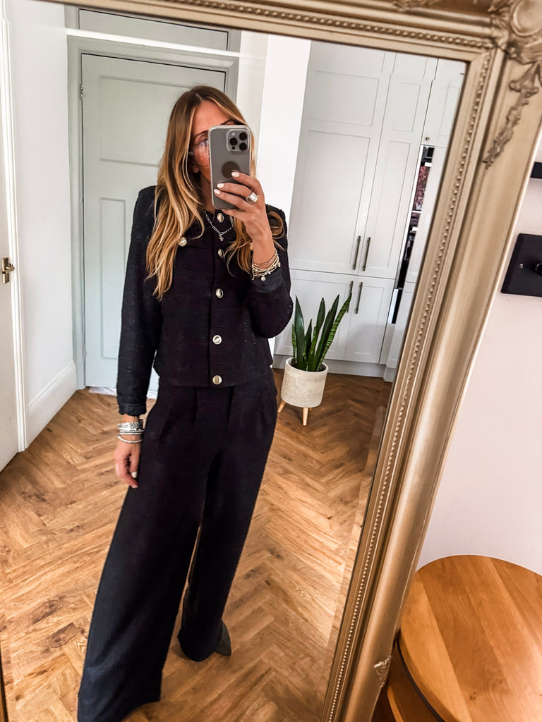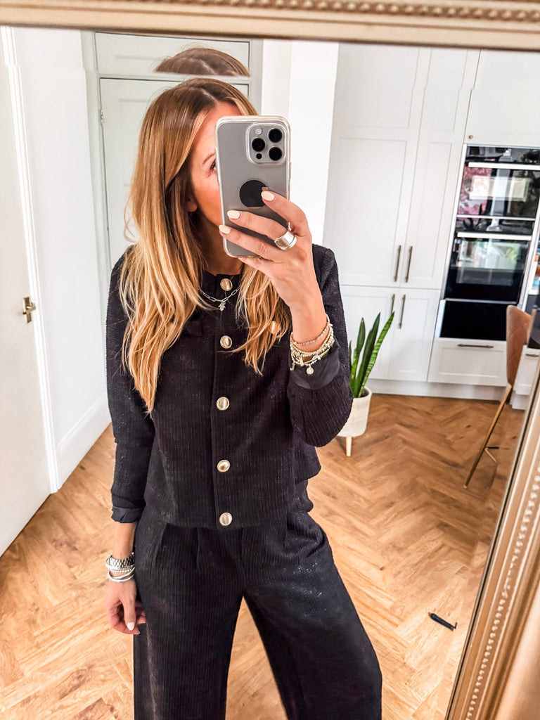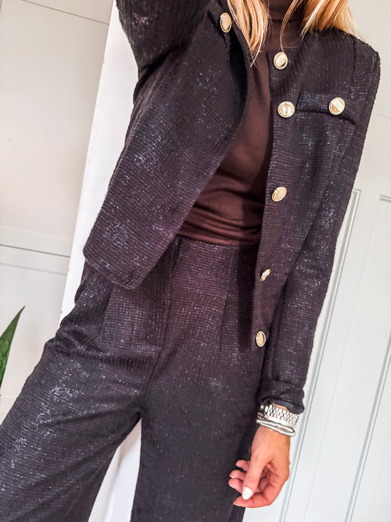 Make a statement with the ICHI Kate Gleam Jacket — a modern take on classic elegance. With sleek gold buttons and subtle glitter fabric, it brings just the right touch of sparkle. Polished yet playful, it's your go-to for elevating any outfit. Matching trousers available!