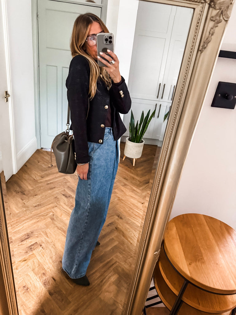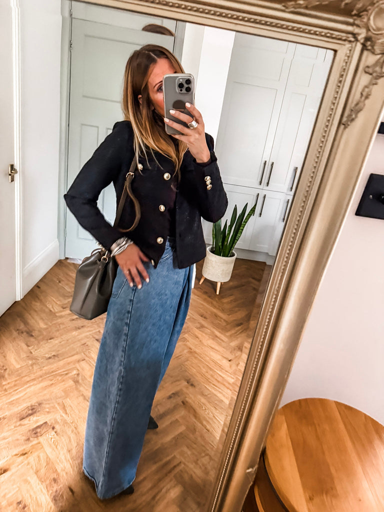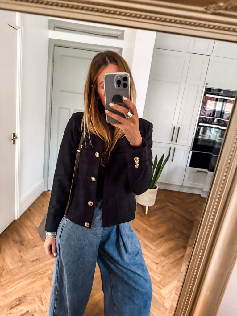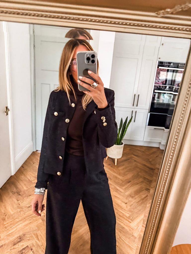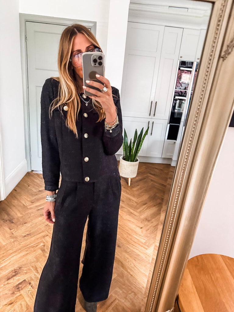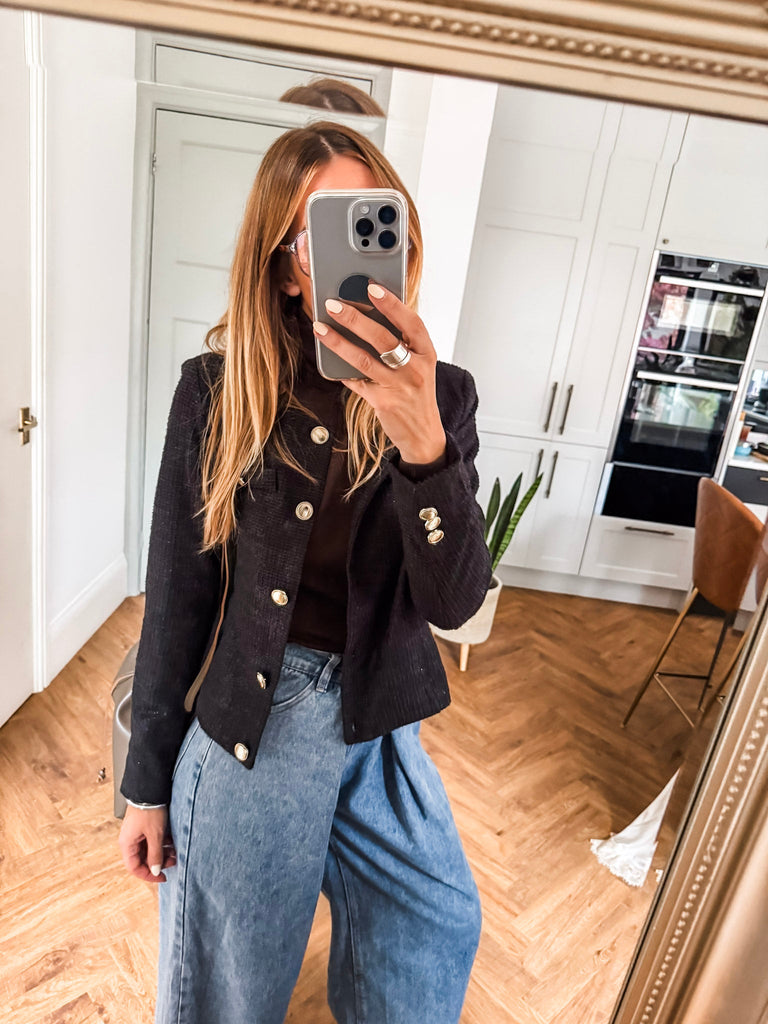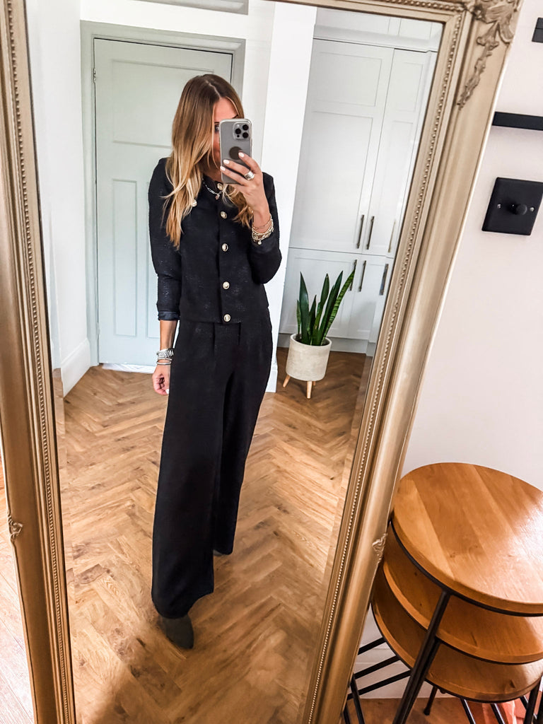 Make a statement with the ICHI Kate Gleam Jacket — a modern take on classic elegance. With sleek gold buttons and subtle glitter fabric, it brings just the right touch of sparkle. Polished yet playful, it's your go-to for elevating any outfit. Matching trousers available!