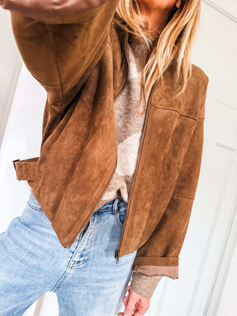 Style this suede cropped jacket over a fitted turtleneck and high-rise jeans for a sleek daytime edge. For nights out, throw it over a slip dress with heeled boots for a bold contrast. Add minimal jewelry to let the statement details shine.
