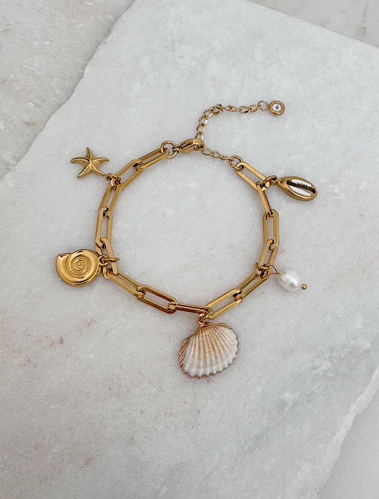 Handmade in our studio this beautiful bracelet is finished with a gold trimmed real shell, pearl, shell and starfish charms.