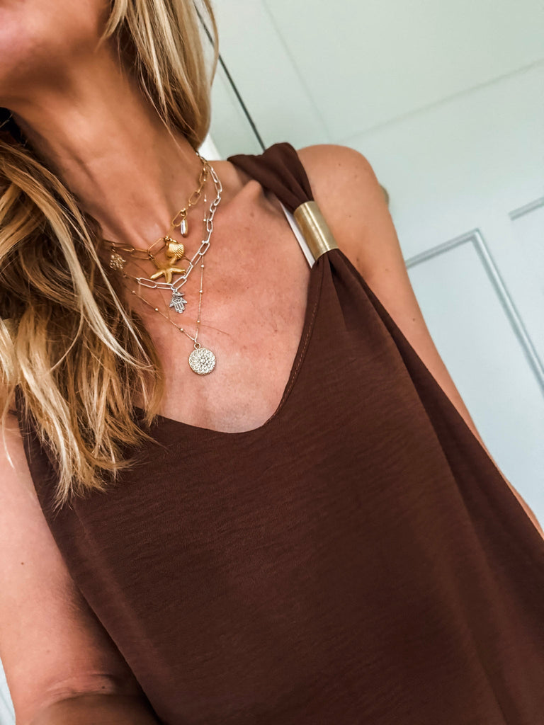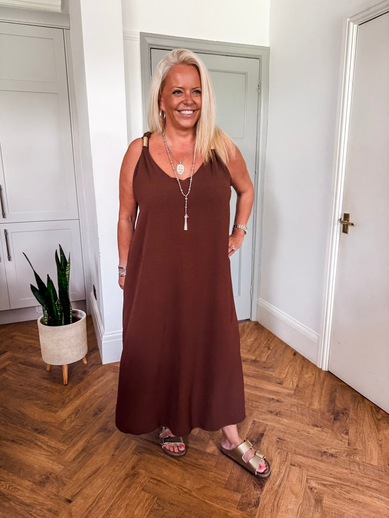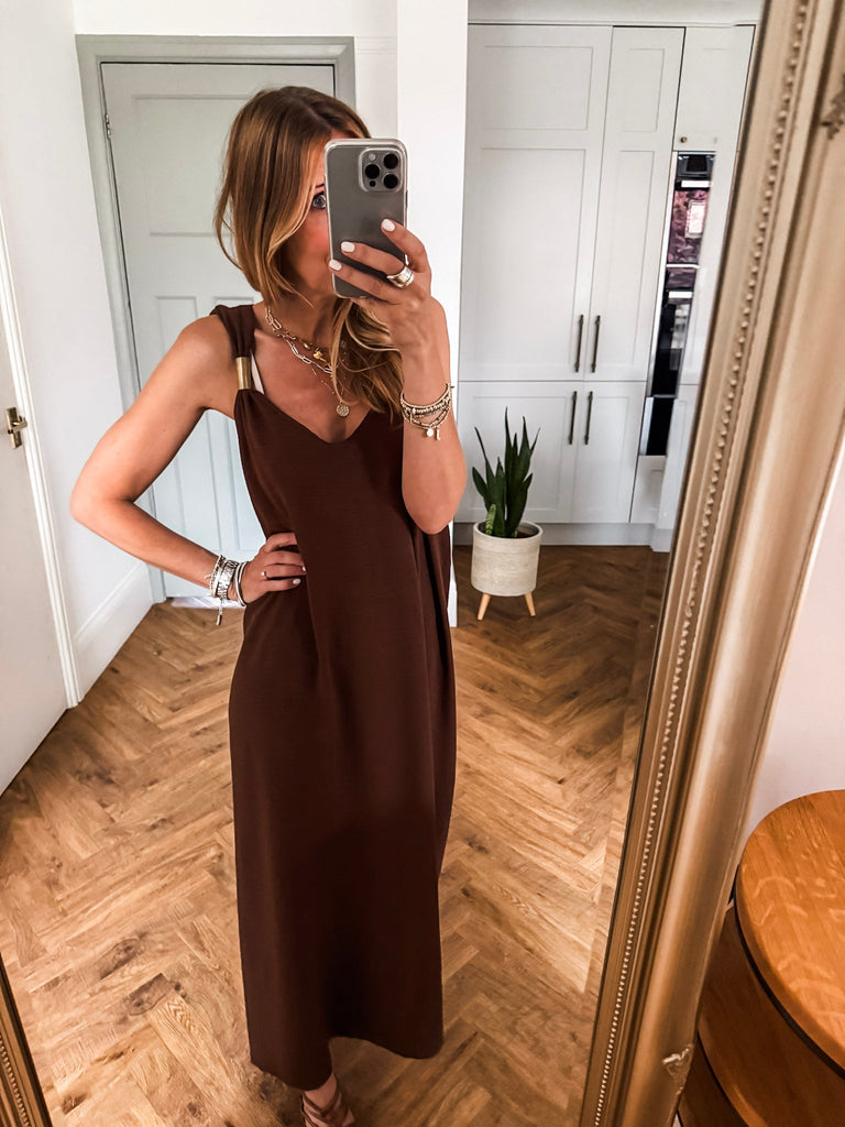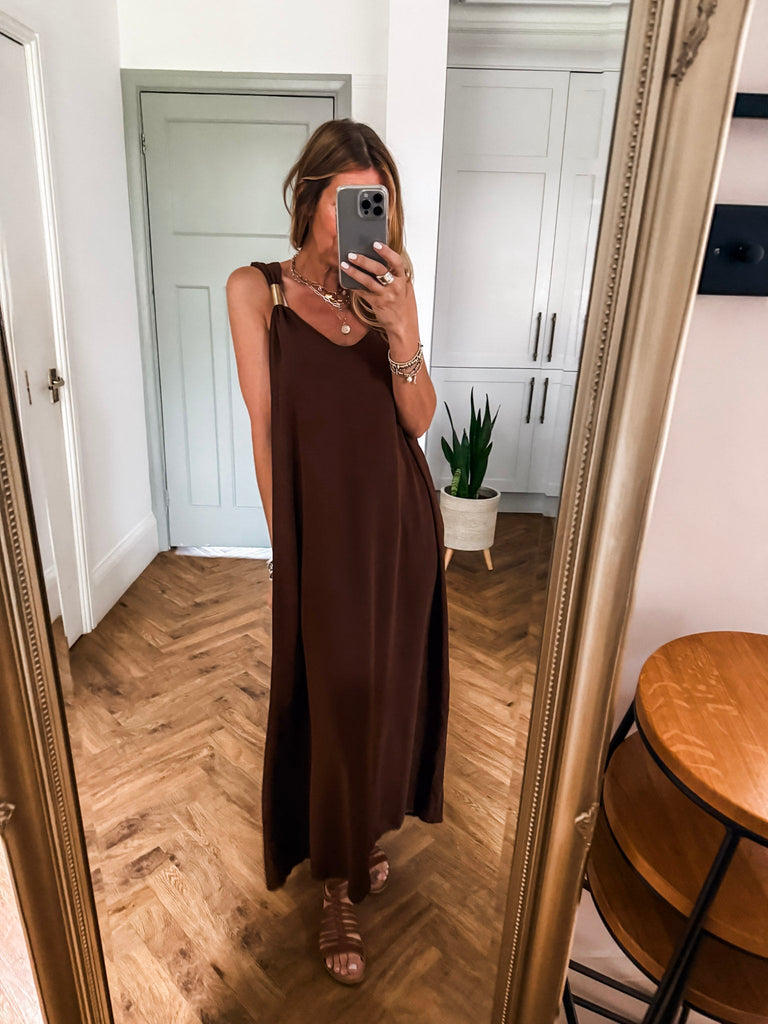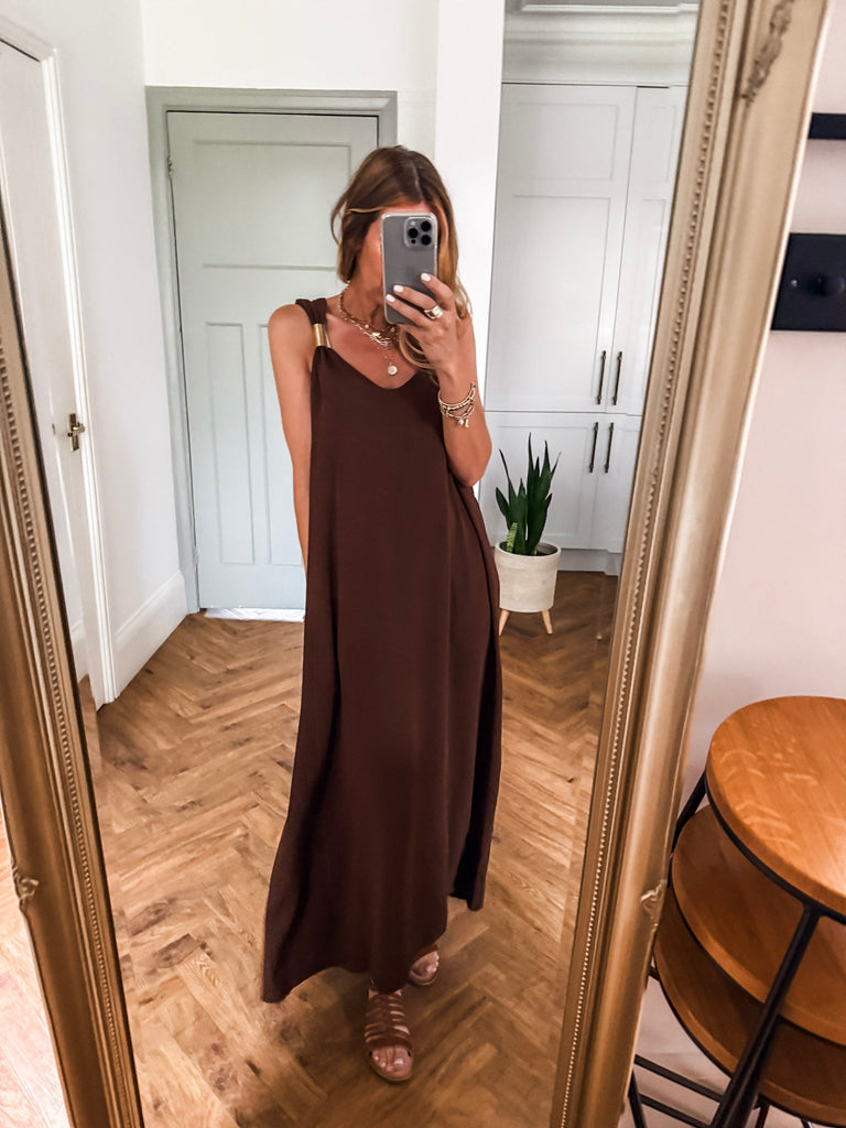 You’ll love the Golden Hour Maxi Dress for its effortless blend of comfort and sophistication. The flowing fabric flatters every movement, while the subtle gold detailing adds just the right amount of shine. It's the kind of piece that makes you feel instantly put-together, no matter the occasion.