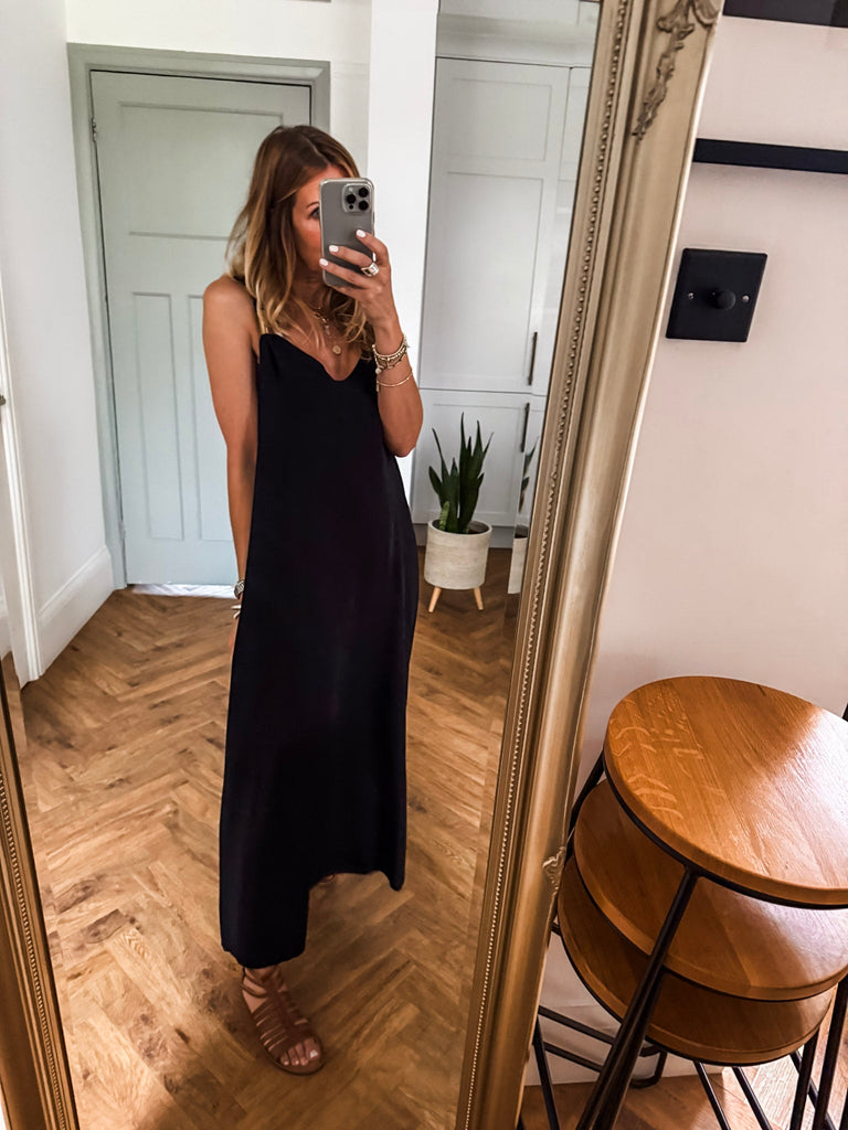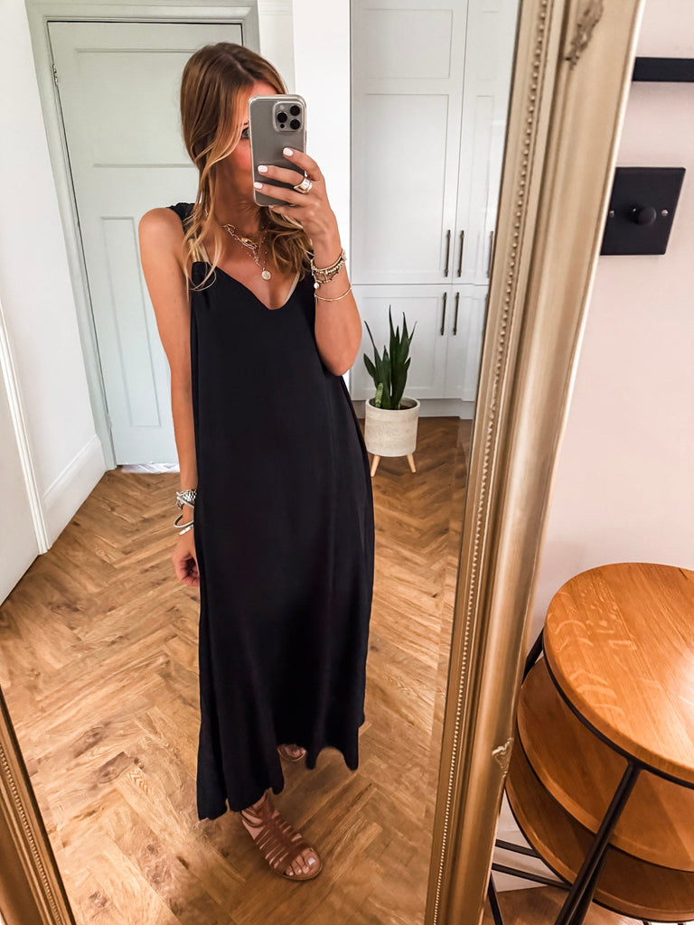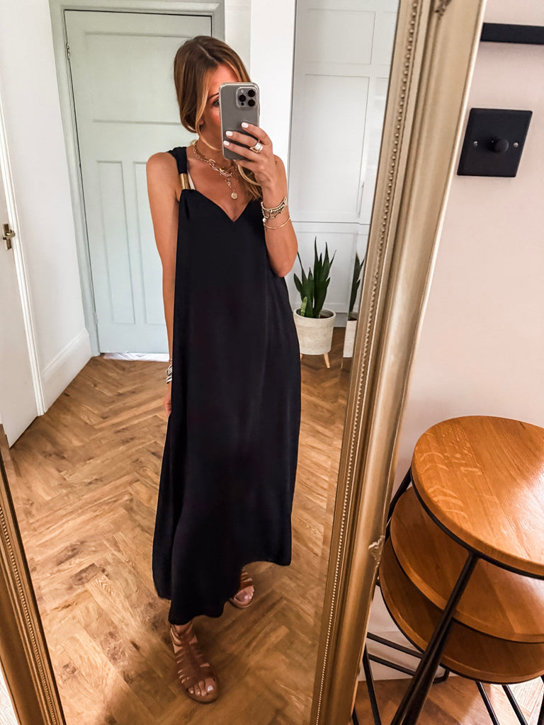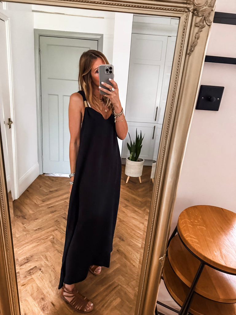 Radiate effortless elegance in the Golden Hour Maxi Dress, designed with a fluid silhouette and a flattering deep V neckline. Subtle gold accents catch the light for a refined touch of shimmer. Perfectly polished yet easy to wear, it’s your go-to for elevated everyday moments or special evenings out.