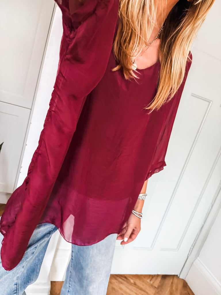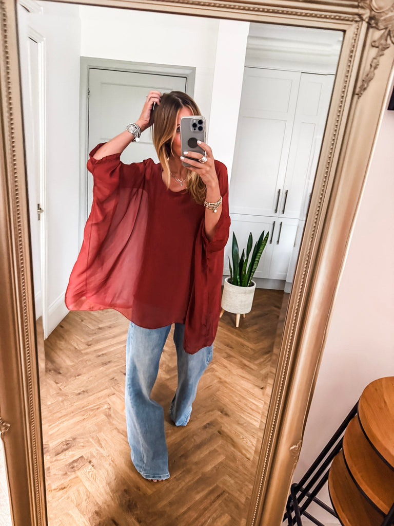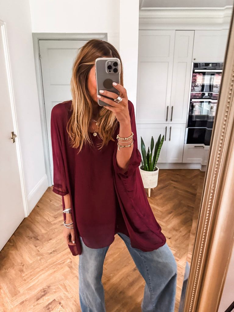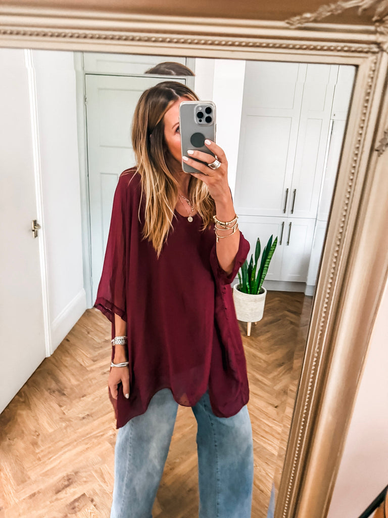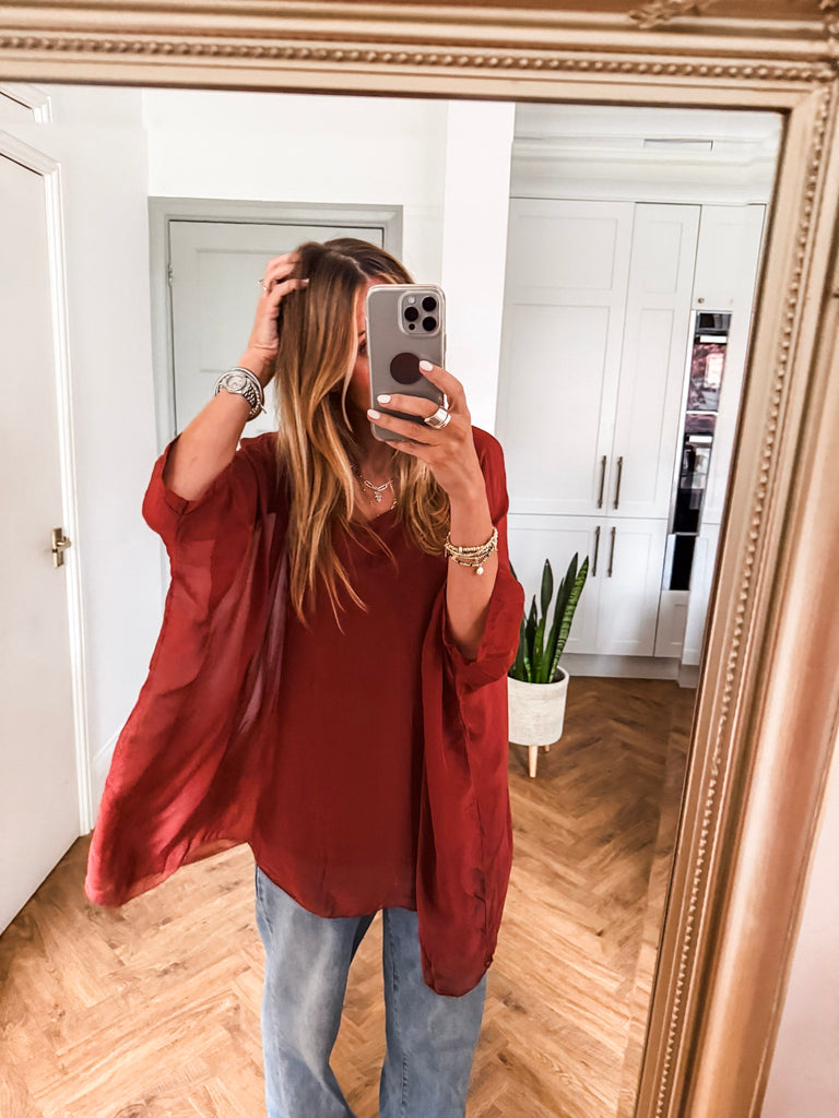 Breezy and elegant, the Waterfall Chiffon Top features sheer fabric and relaxed batwing sleeves for effortless movement. A soft lining adds comfort and coverage, while the fluid silhouette creates a striking yet easygoing look. Wear it solo or layered for versatile, day-to-night style.