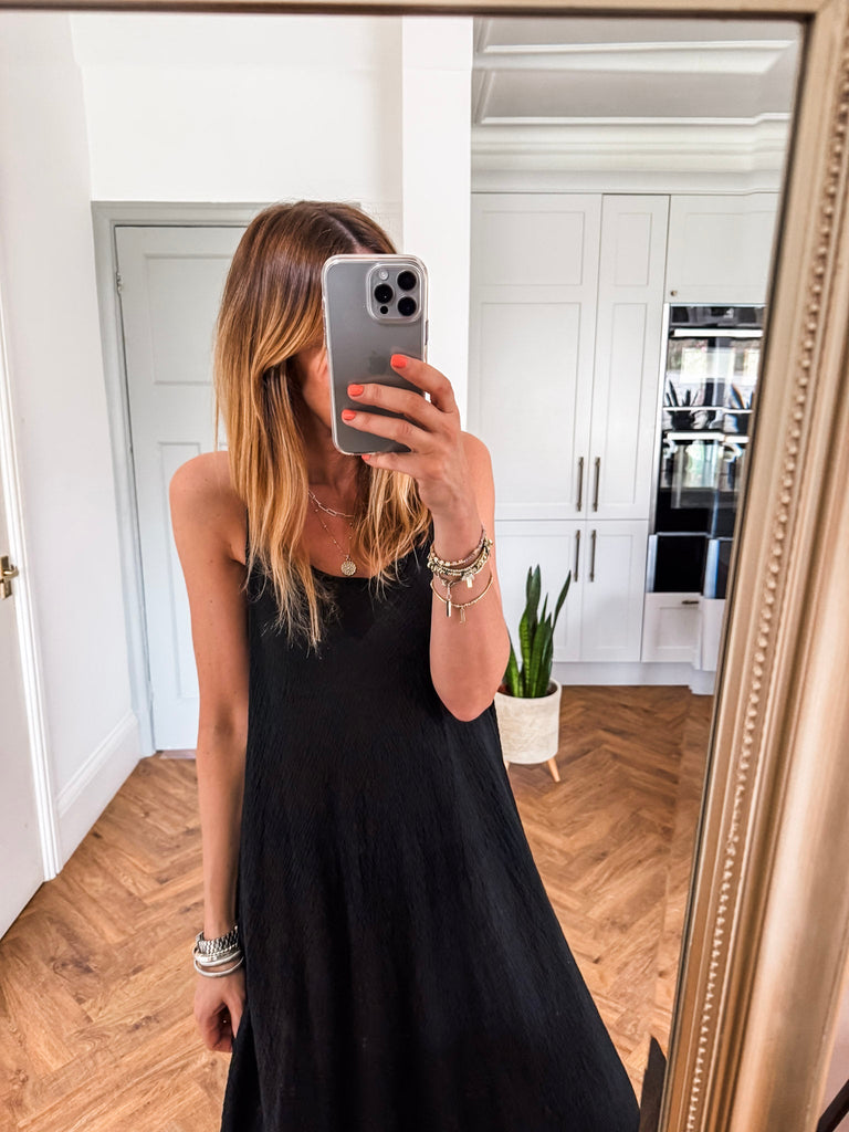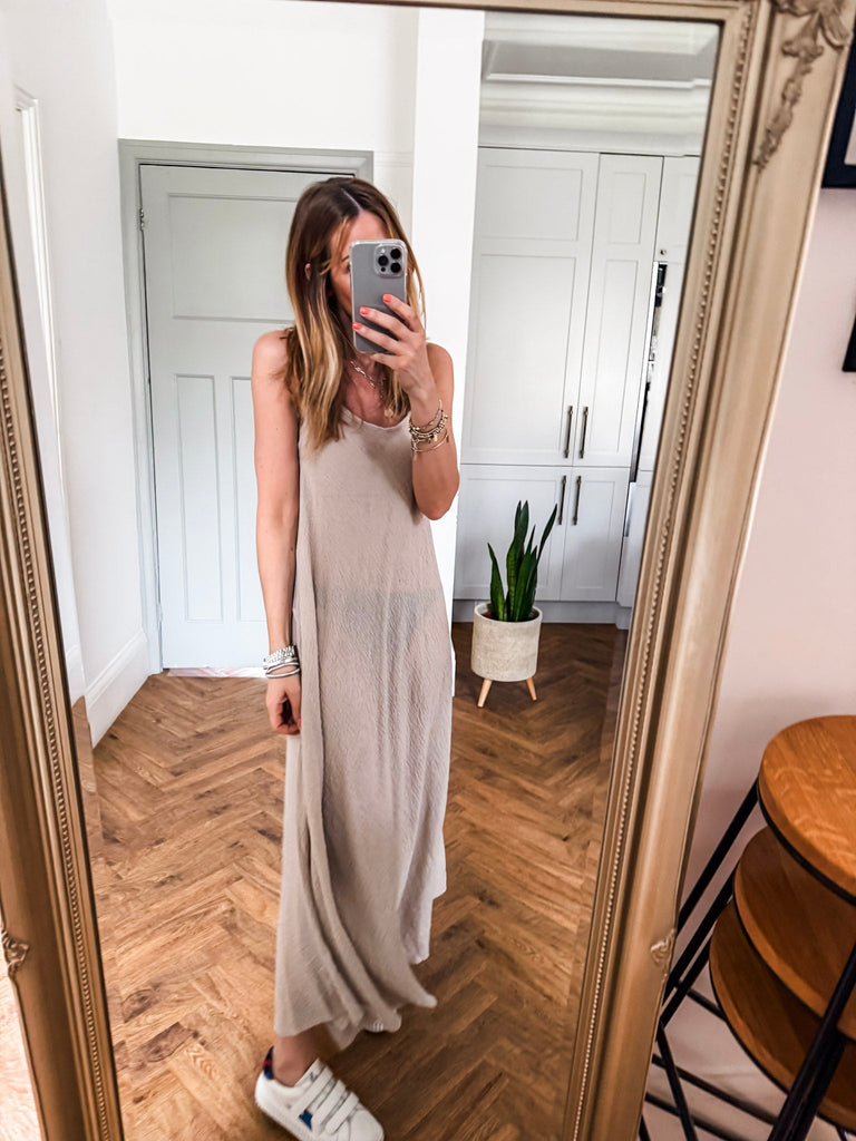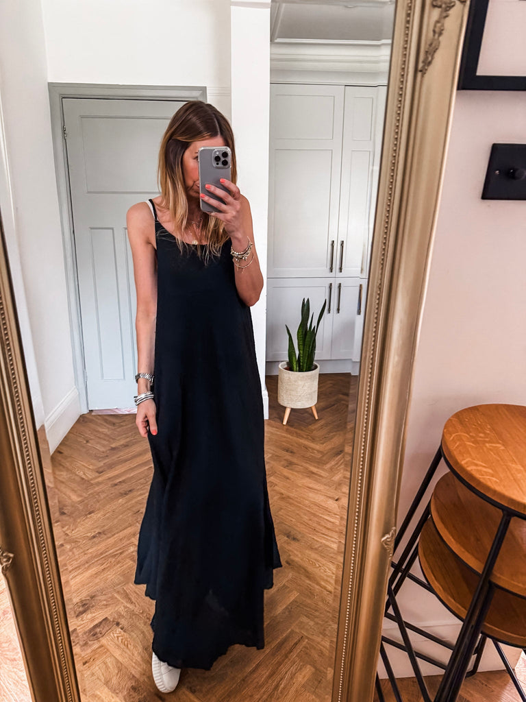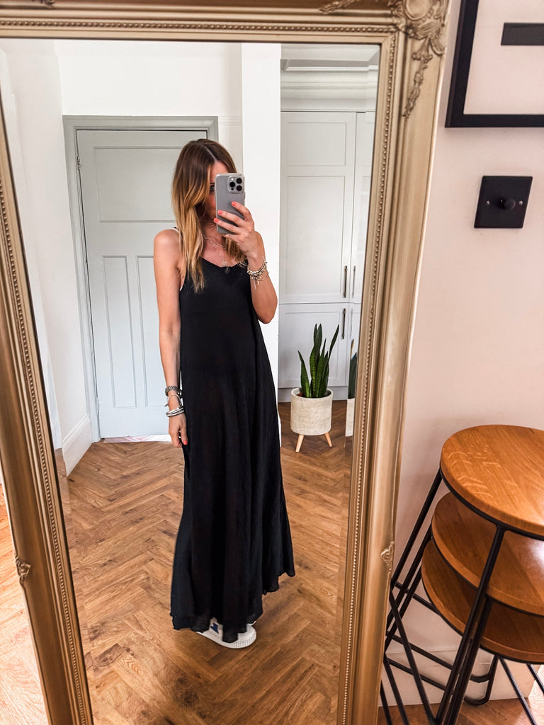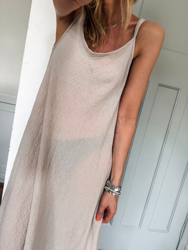 We love this dress for its effortless, relaxed fit that’s perfect for warm weather and laid-back days. The simple straps and flowy maxi length offer a flattering and comfortable silhouette. Versatile, breezy, and easy to style, it’s the ultimate go-to dress for beach days and beyond.