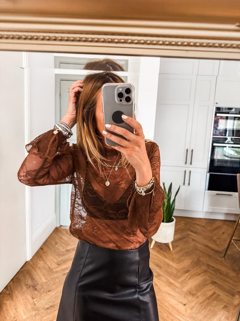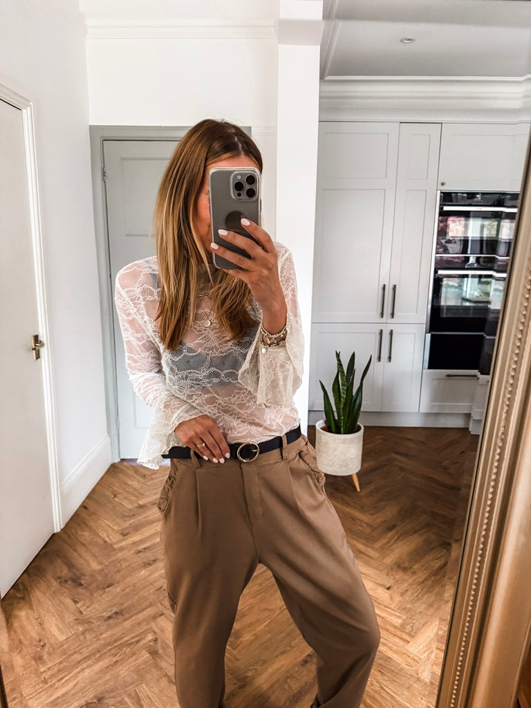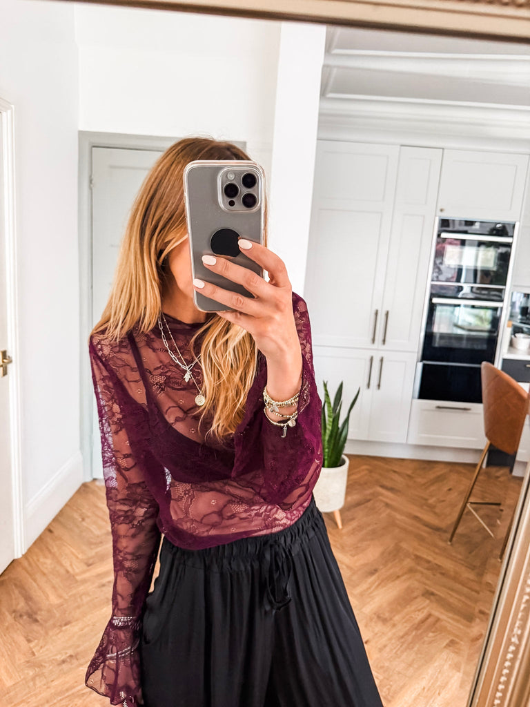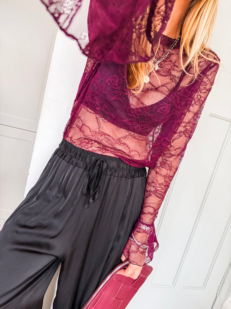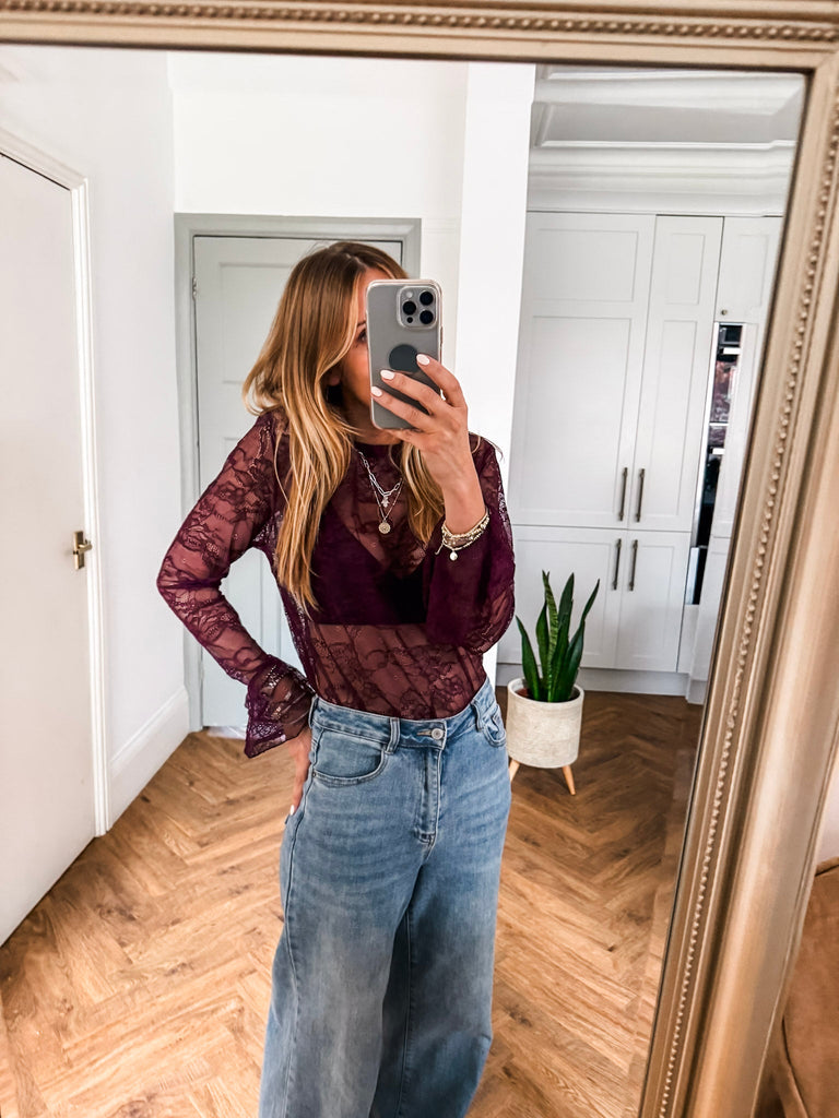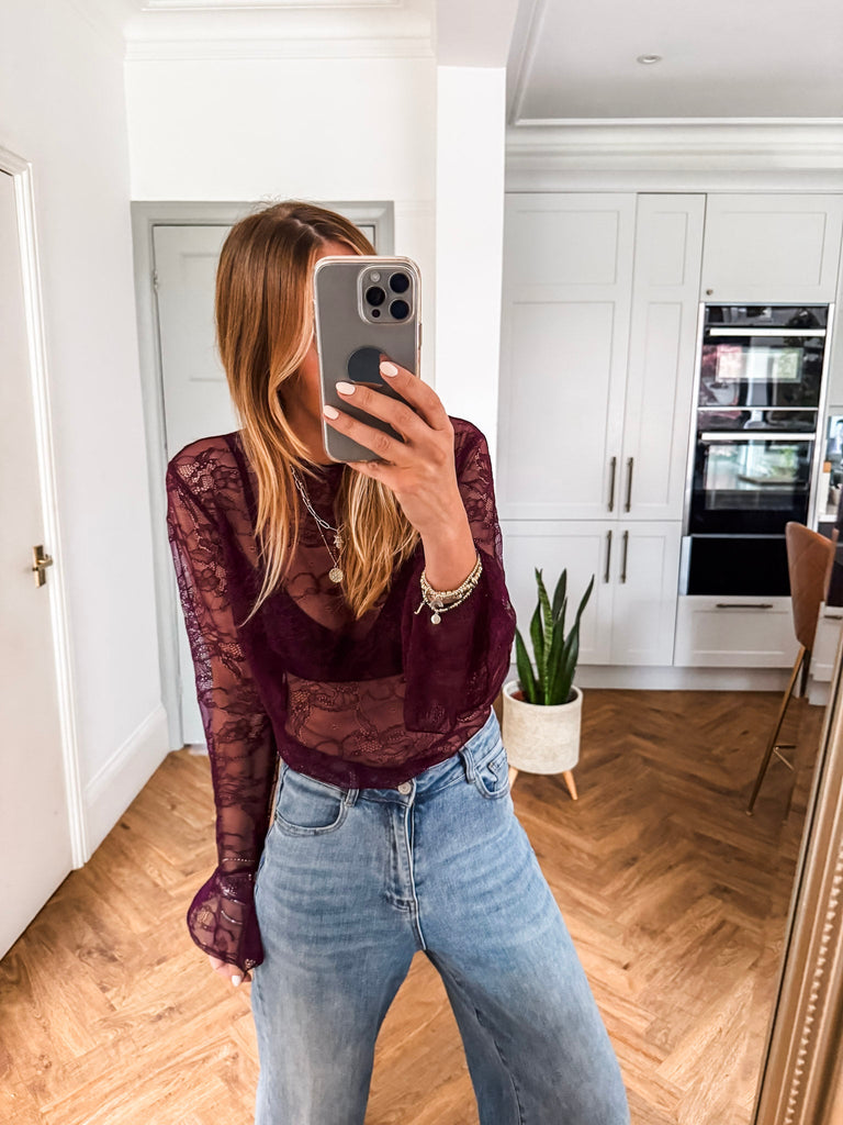 Style your look with this Bell Sleeve Lace Top, featuring a high crew neck and flowing sleeves for an effortlessly feminine feel. Crafted from delicate lace in a relaxed fit, it blends softness with subtle edge. The perfect piece to add texture and charm to any outfit.