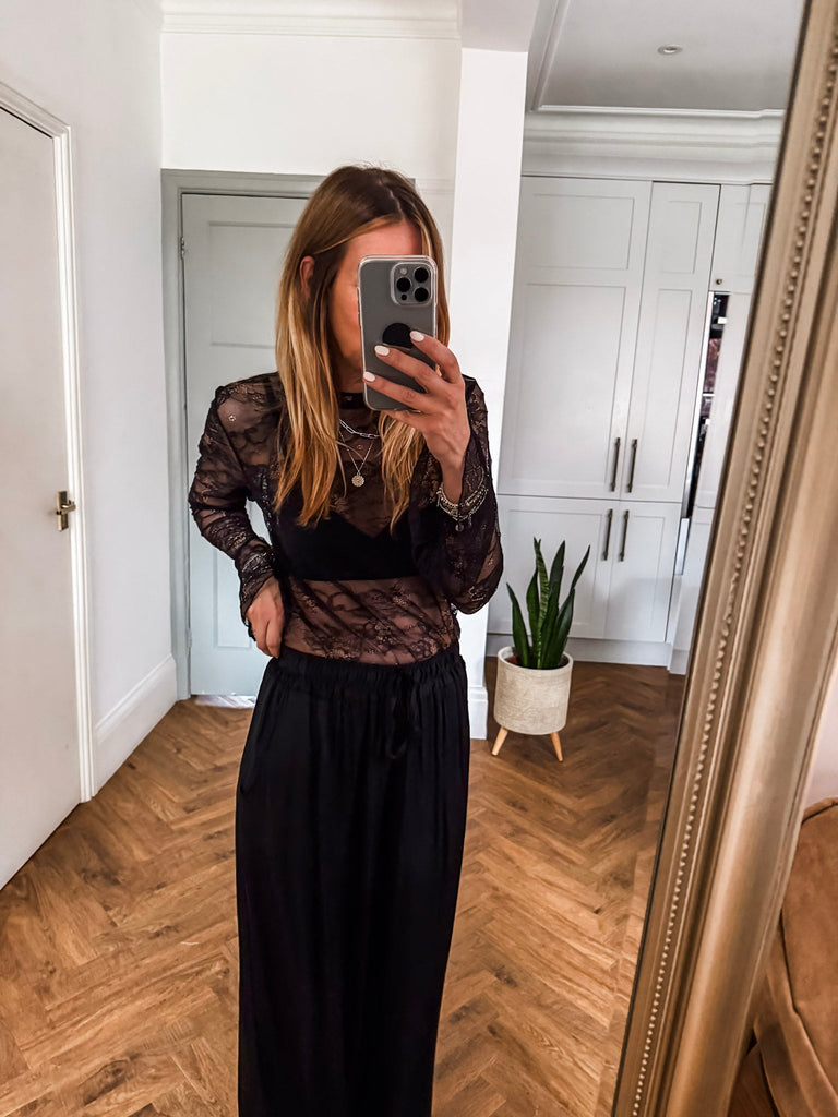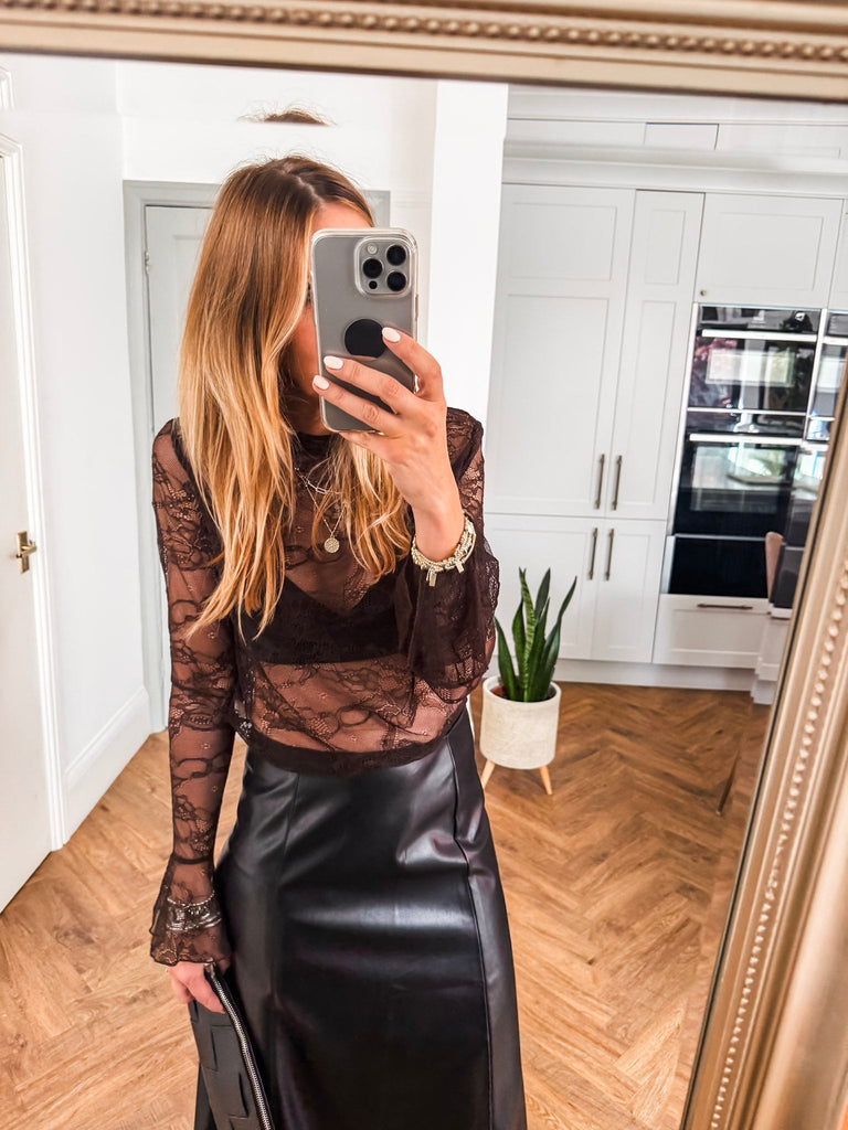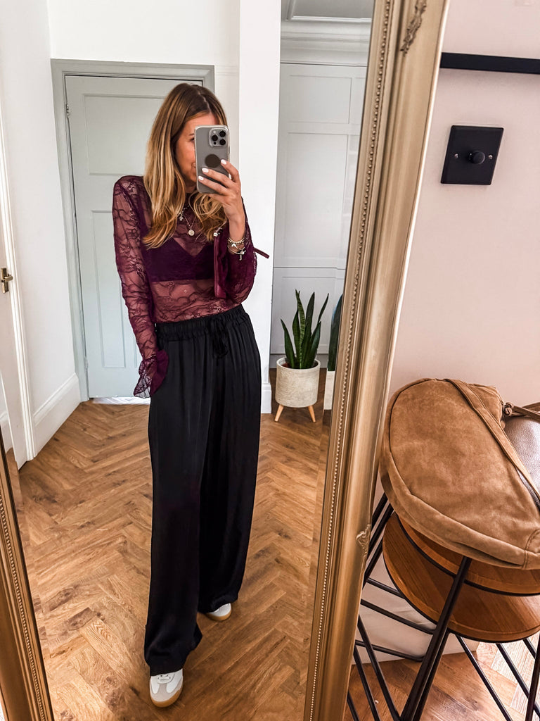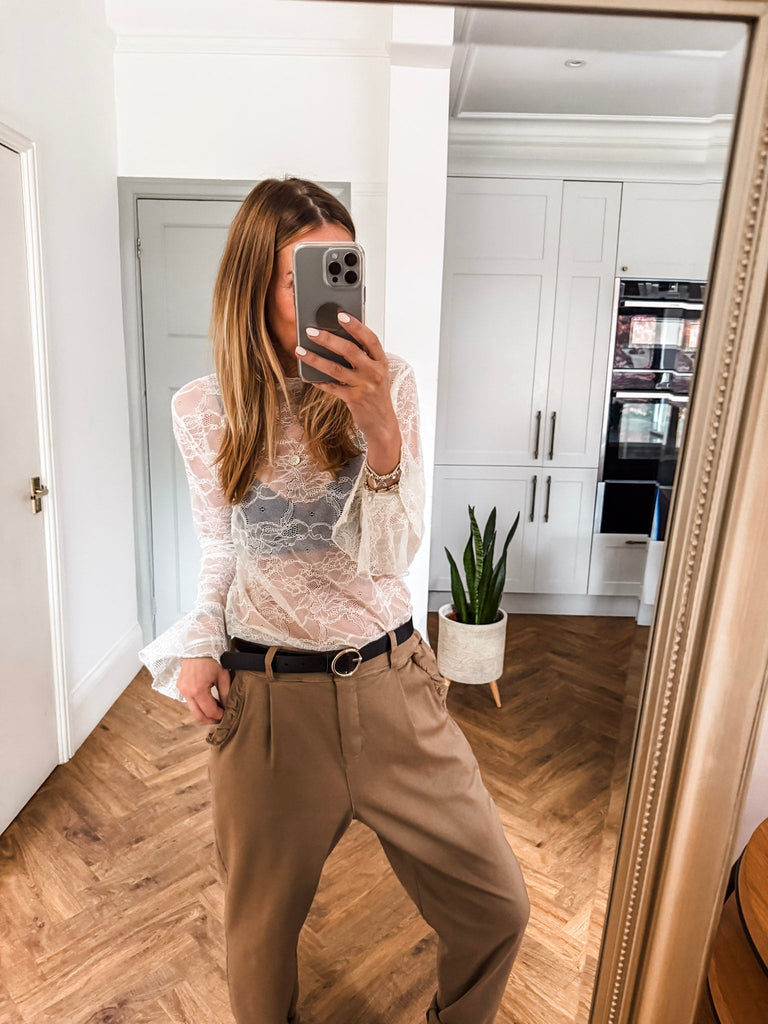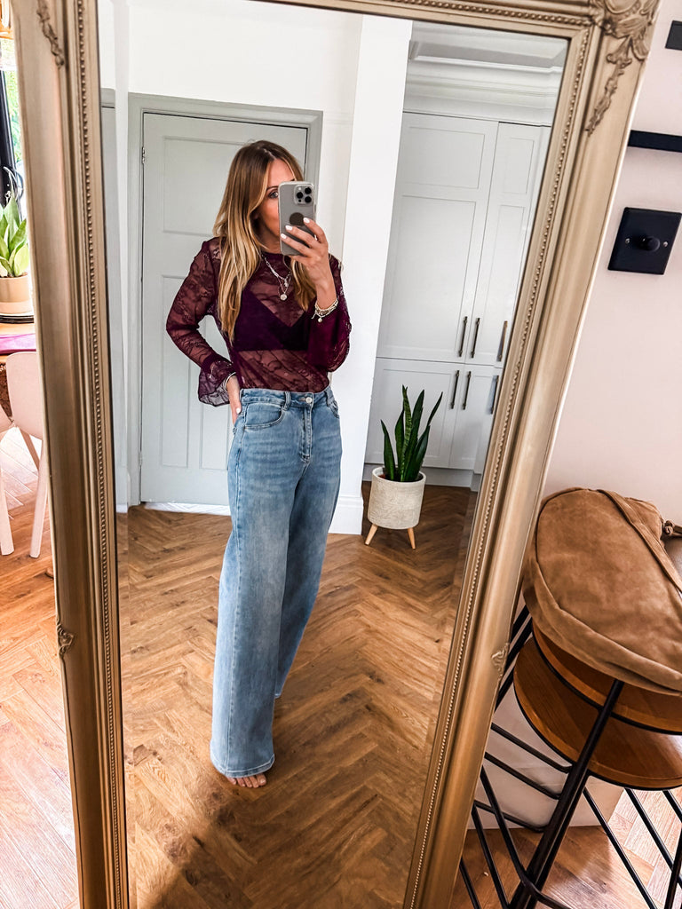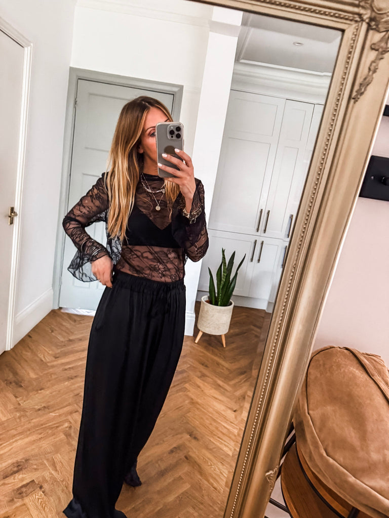 Style your look with this Bell Sleeve Lace Top, featuring a high crew neck and flowing sleeves for an effortlessly feminine feel. Crafted from delicate lace in a relaxed fit, it blends softness with subtle edge. The perfect piece to add texture and charm to any outfit.