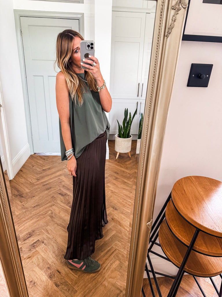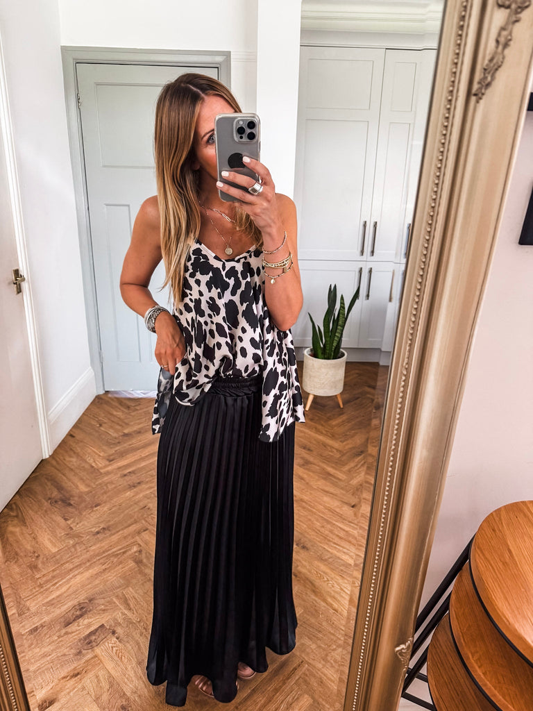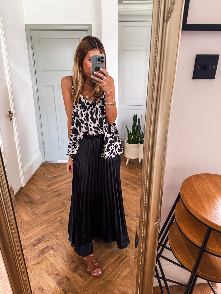 Effortlessly elegant, this silky pleated maxi skirt brings fluid movement and timeless style to your wardrobe. Crafted from a smooth, lightweight fabric with a lustrous finish, it features finely pressed pleats that add graceful texture and flow. The full-length silhouette creates a flattering drape, while the elasticated waistband offers comfort and a flexible fit—perfect for both casual and dressier occasions. Pair it with a tucked-in blouse or a simple tee for an elevated yet easygoing look.