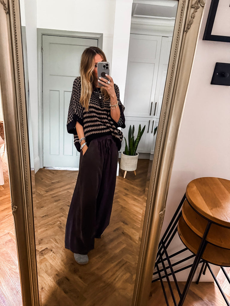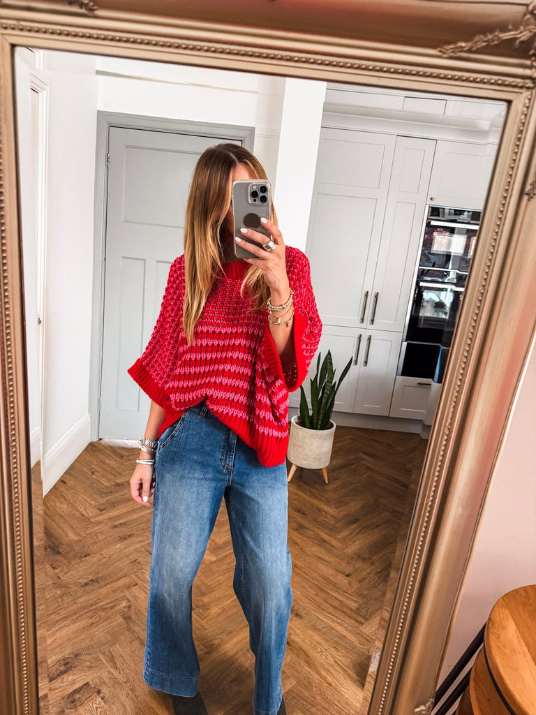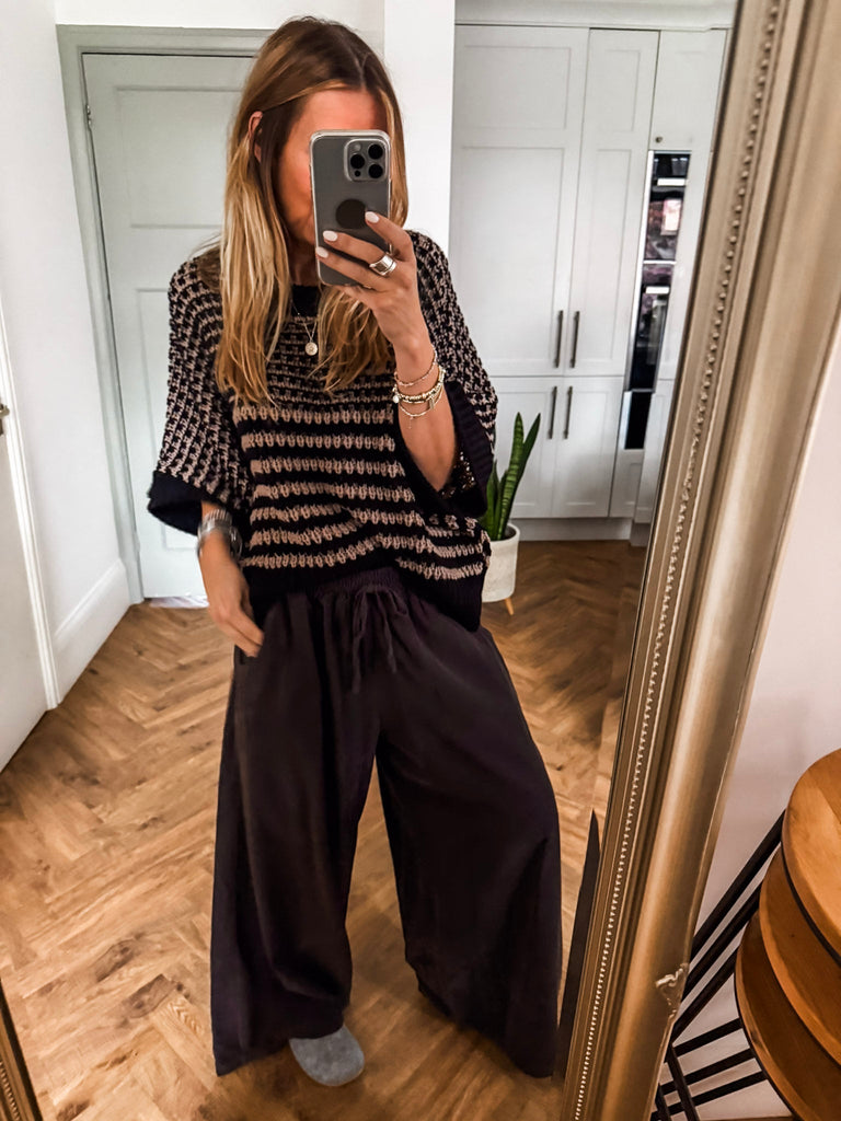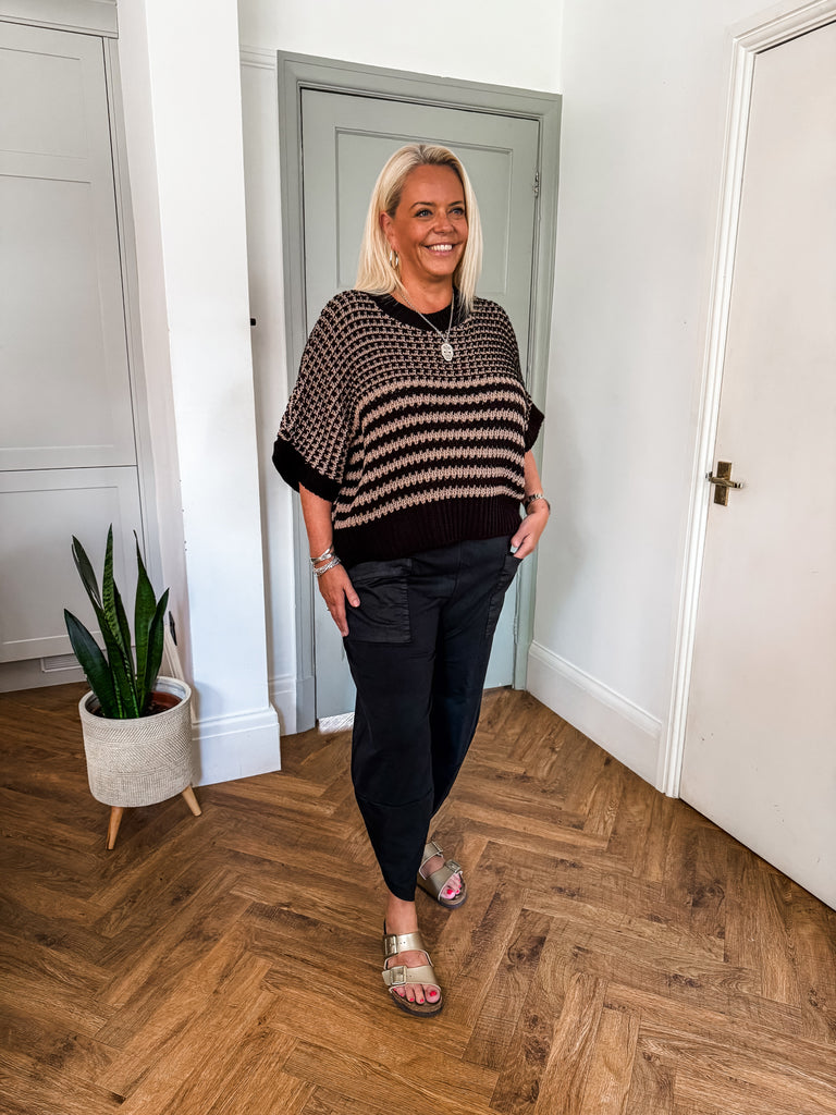 Stay effortlessly cool in the Two-Tone Chunky Knit Jumper, featuring bold stripes and unique cross-stitch detailing. With its relaxed fit and batwing sleeves, it’s all about comfort with a stylish edge. Perfect for layering or making a statement on its own.