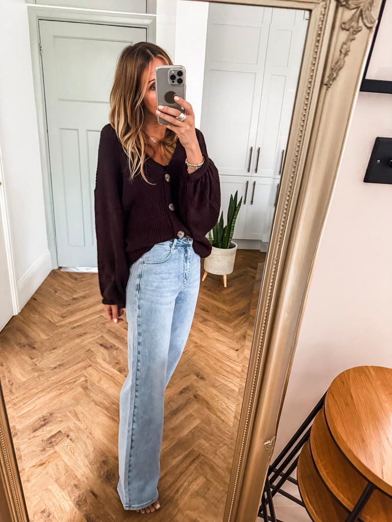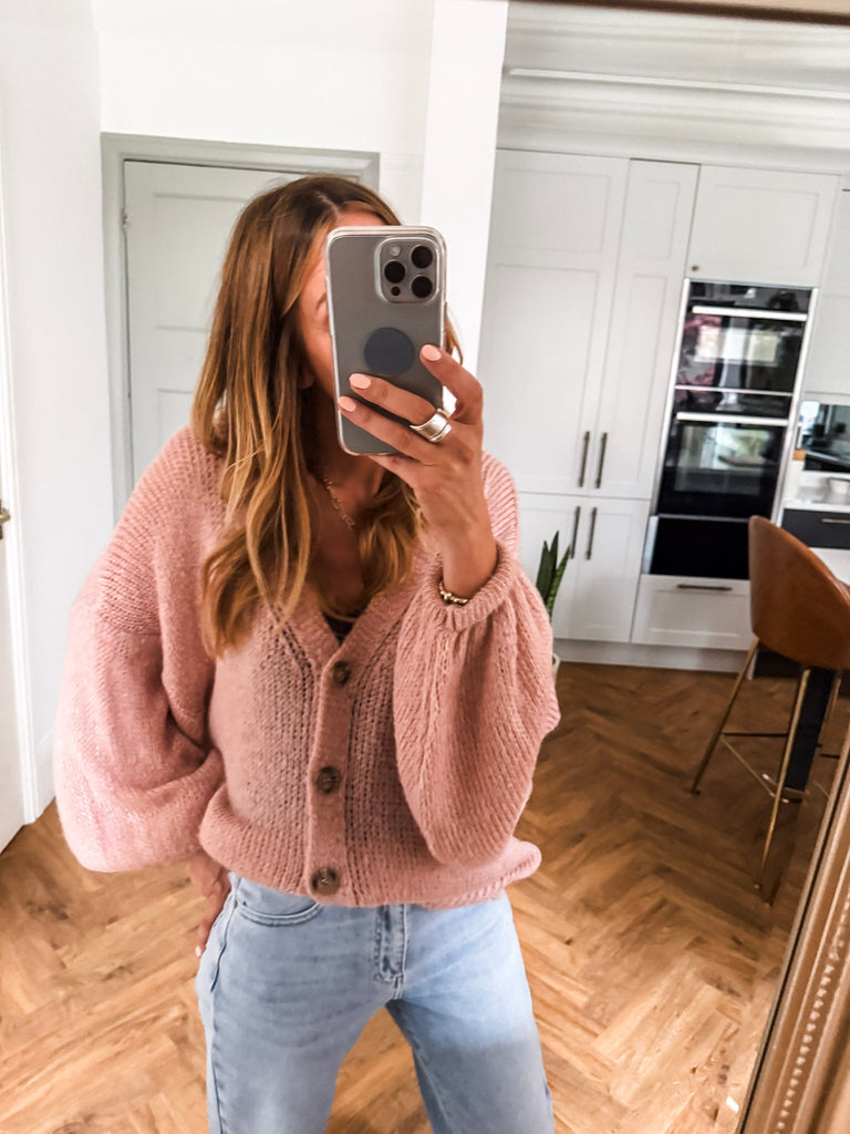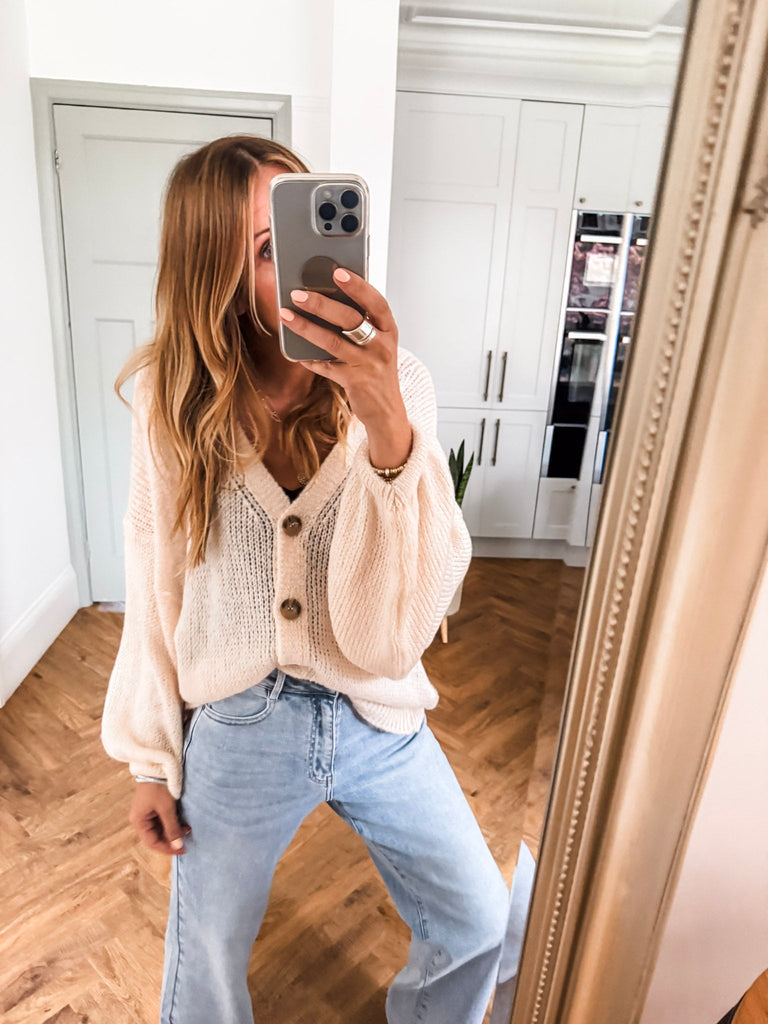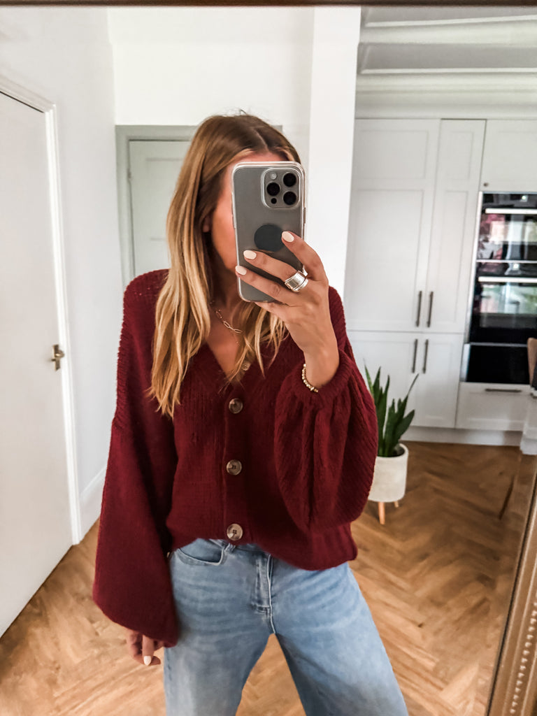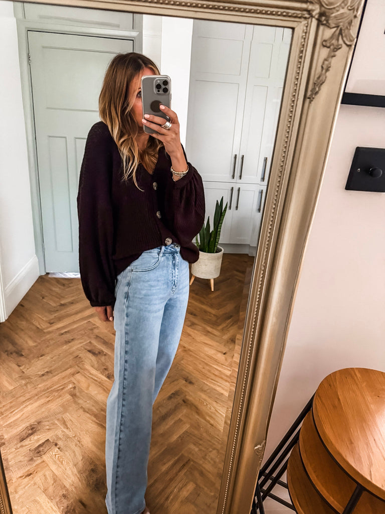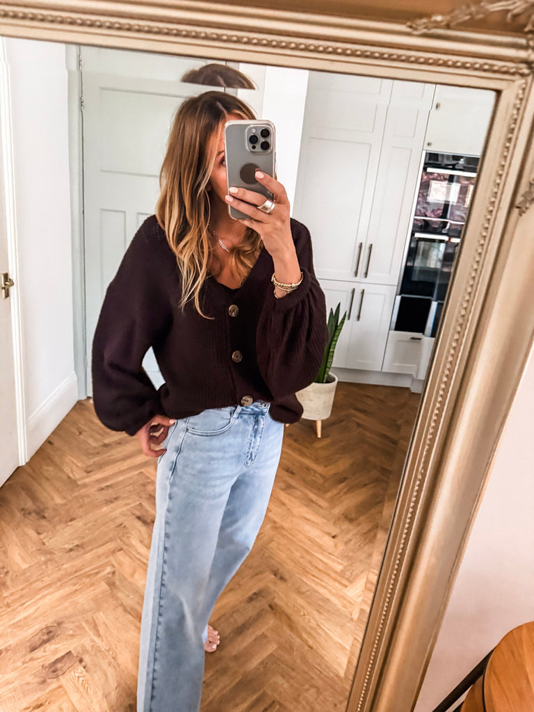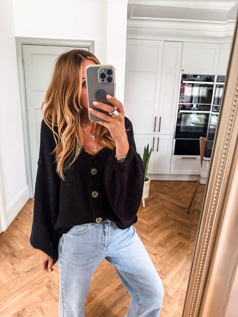Layer the Balloon Sleeve Button Cardigan over a fitted tank and wide-leg jeans for a relaxed, on-trend look. Wear it buttoned up with a midi skirt and boots for an elevated everyday outfit. Add bold earrings or a structured bag to complete the vibe.