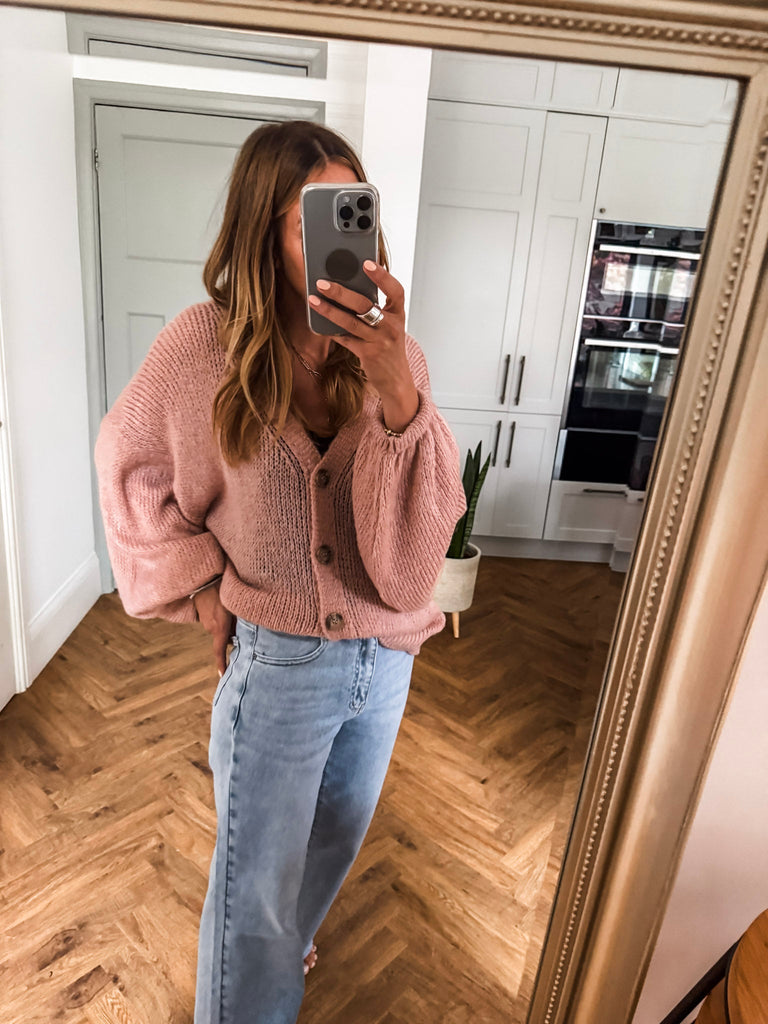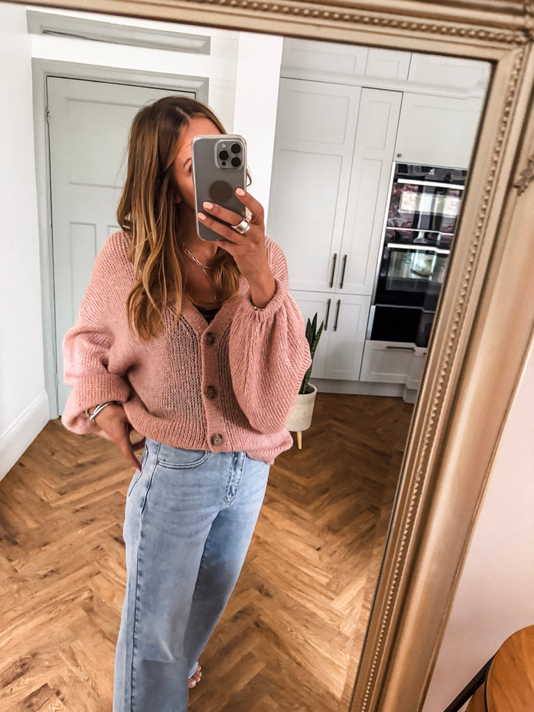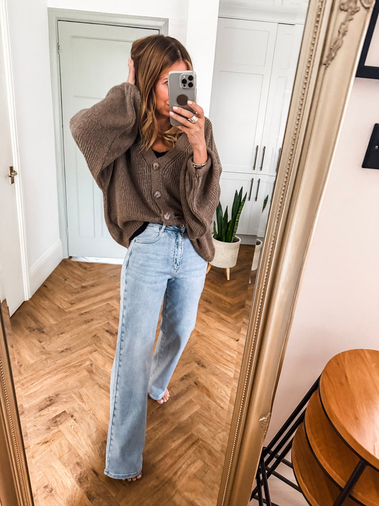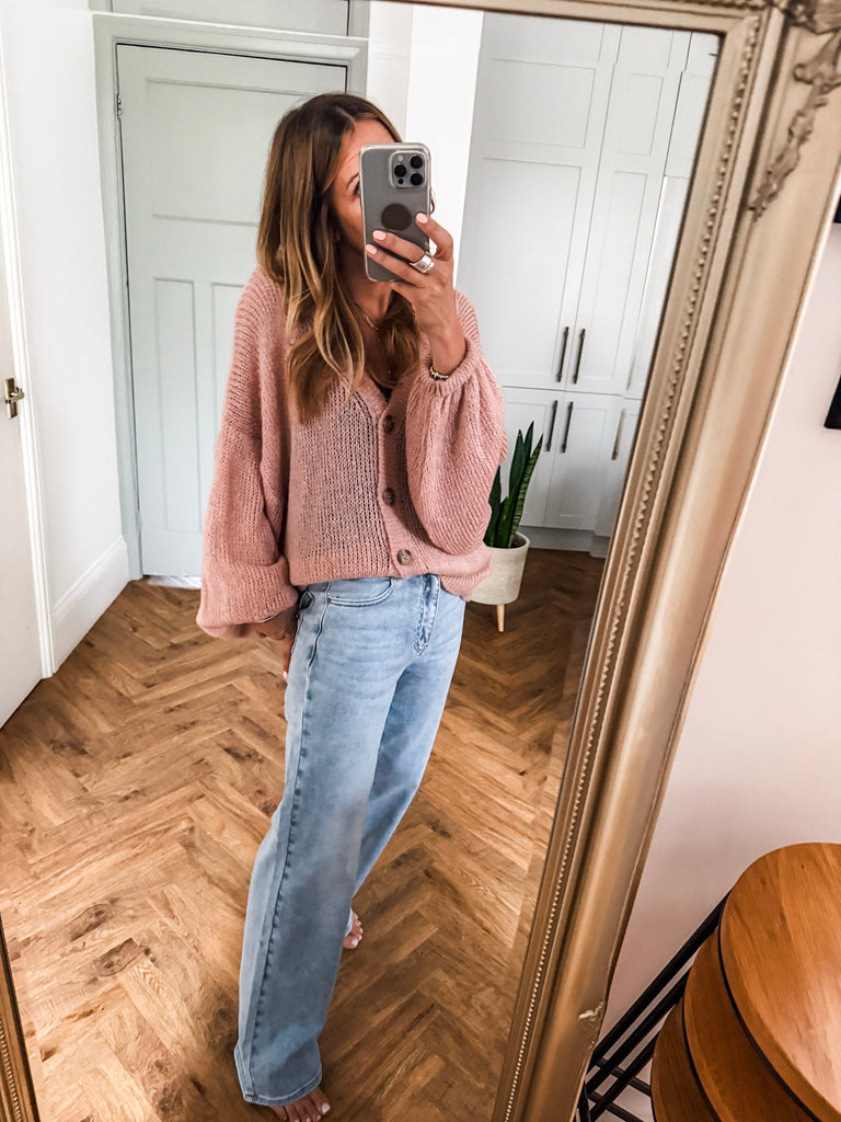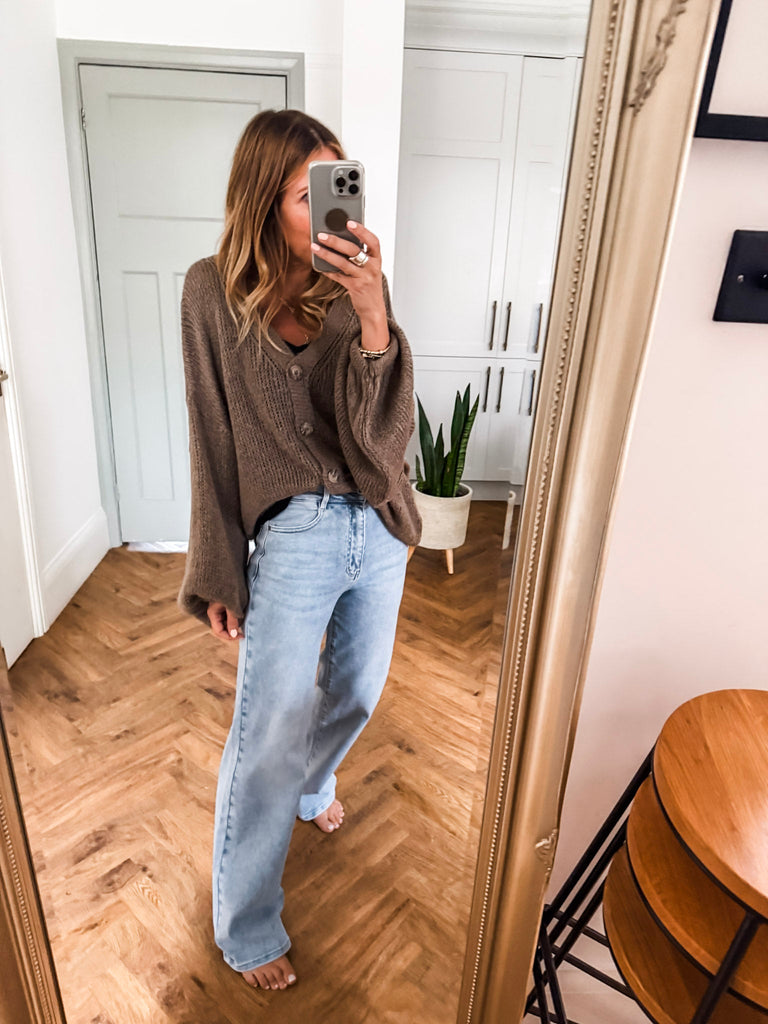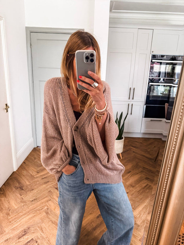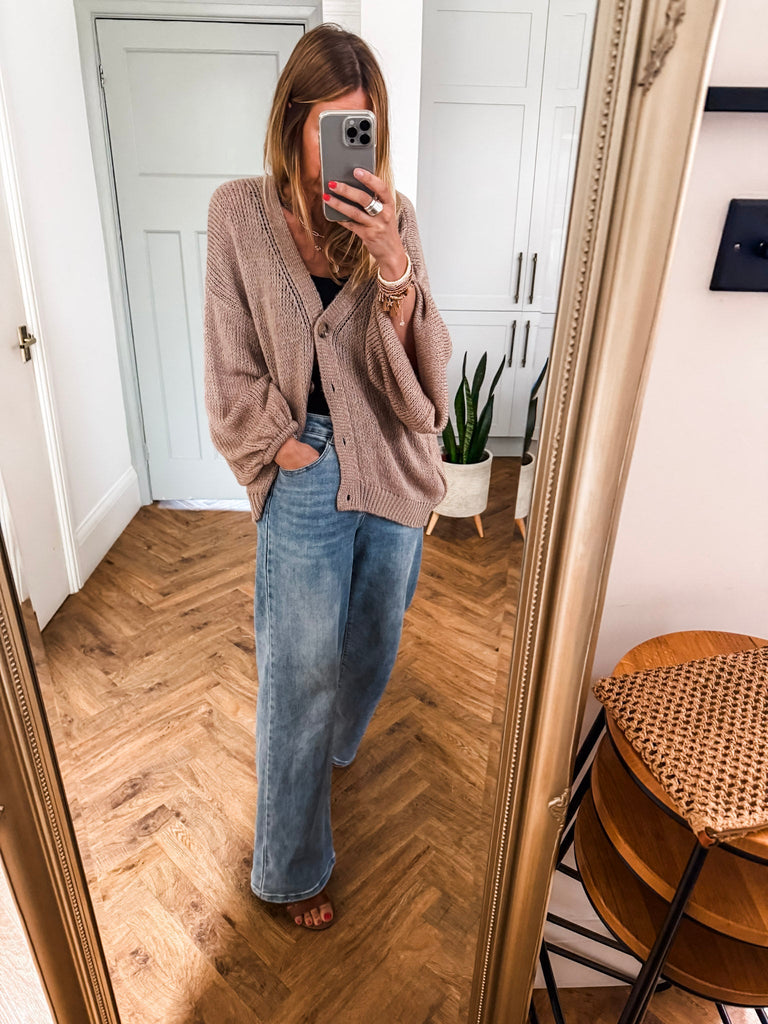 Layer the Balloon Sleeve Button Cardigan over a fitted tank and wide-leg jeans for a relaxed, on-trend look. Wear it buttoned up with a midi skirt and boots for an elevated everyday outfit. Add bold earrings or a structured bag to complete the vibe.