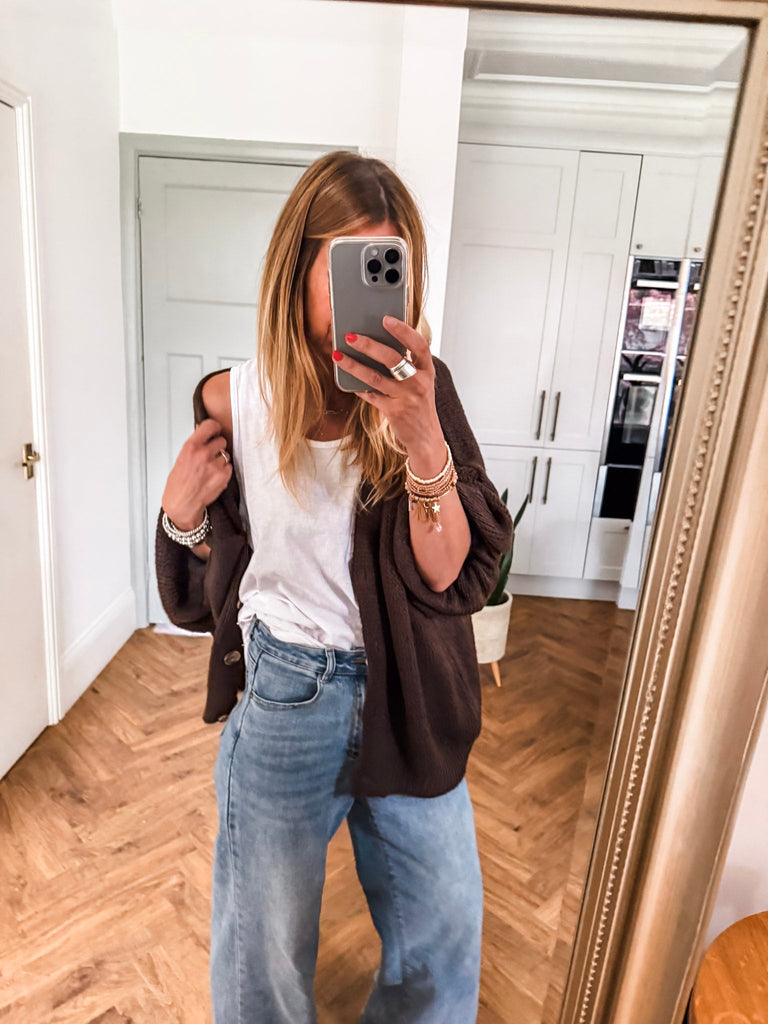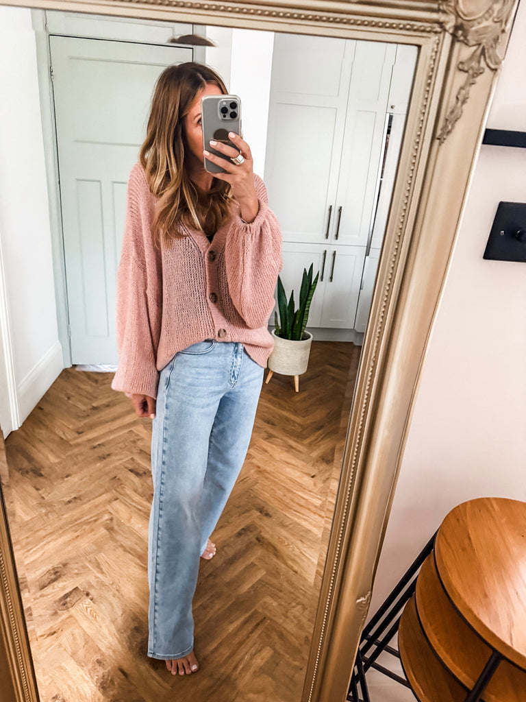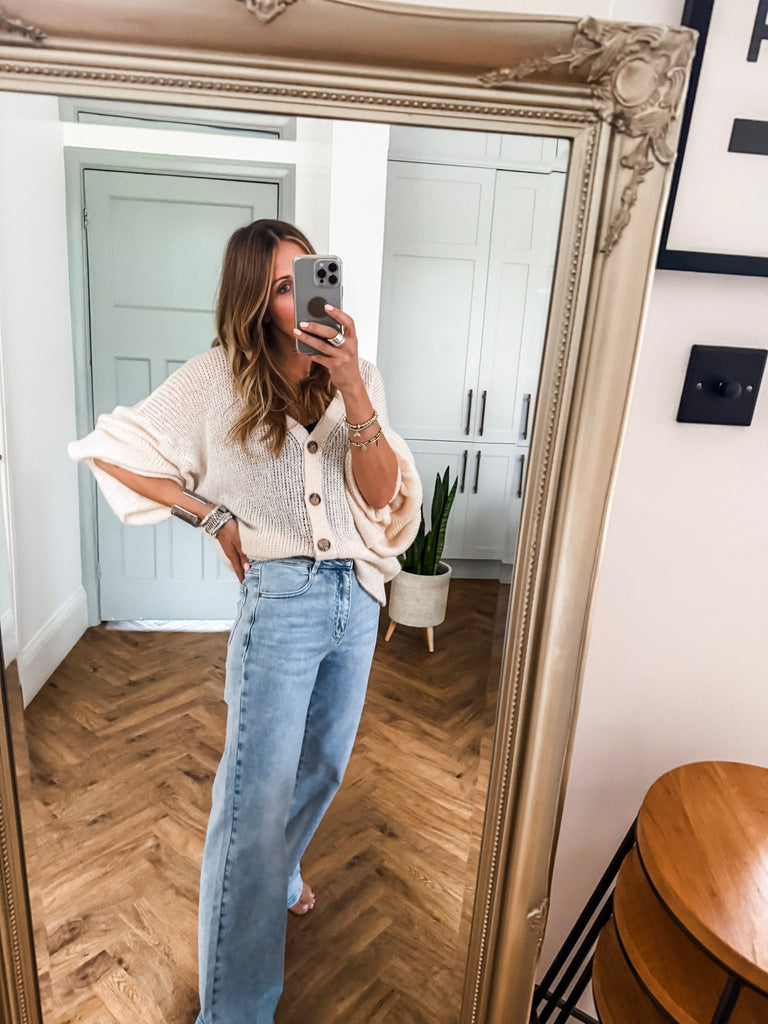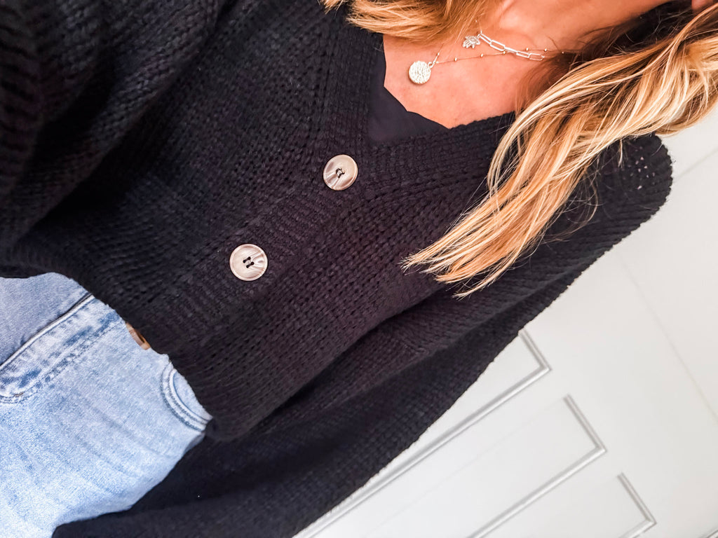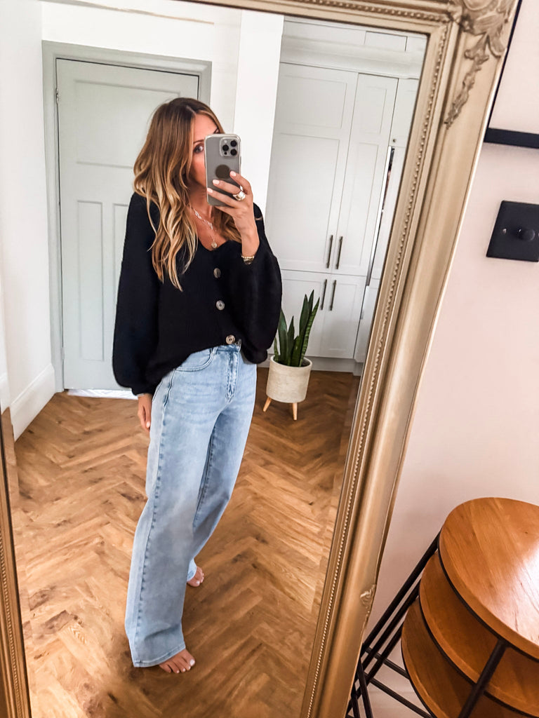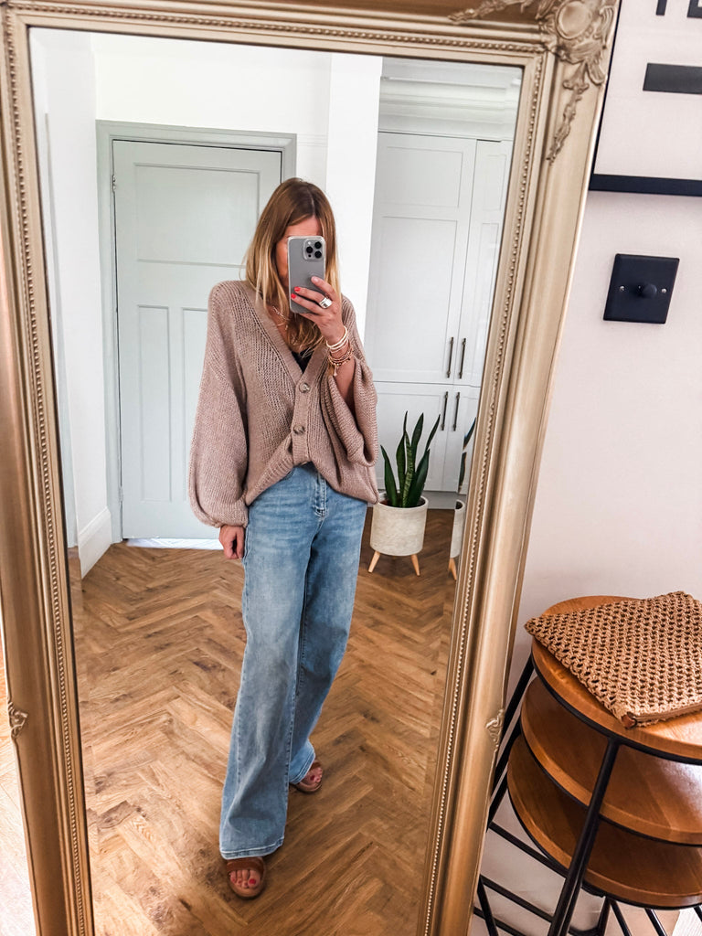 Layer the Balloon Sleeve Button Cardigan over a fitted tank and wide-leg jeans for a relaxed, on-trend look. Wear it buttoned up with a midi skirt and boots for an elevated everyday outfit. Add bold earrings or a structured bag to complete the vibe.