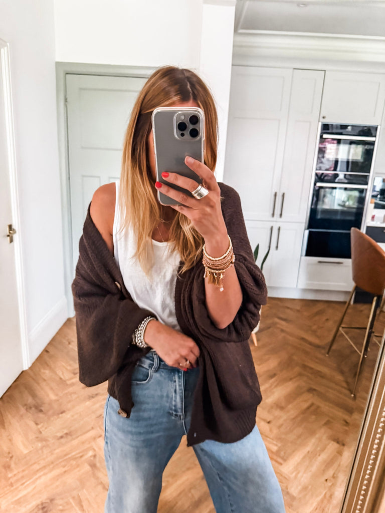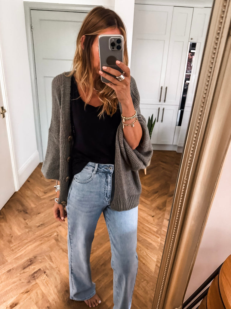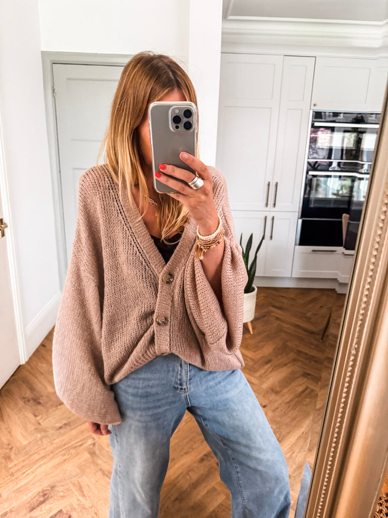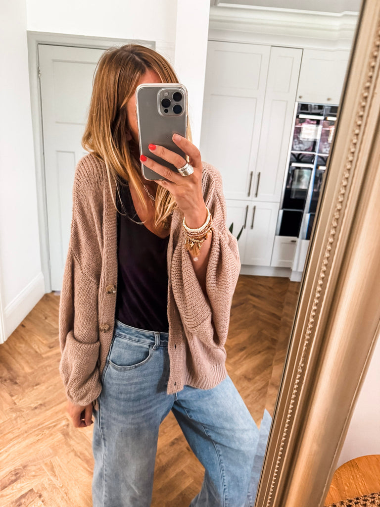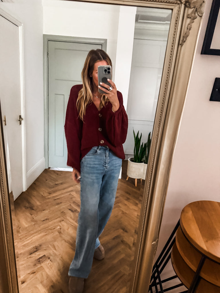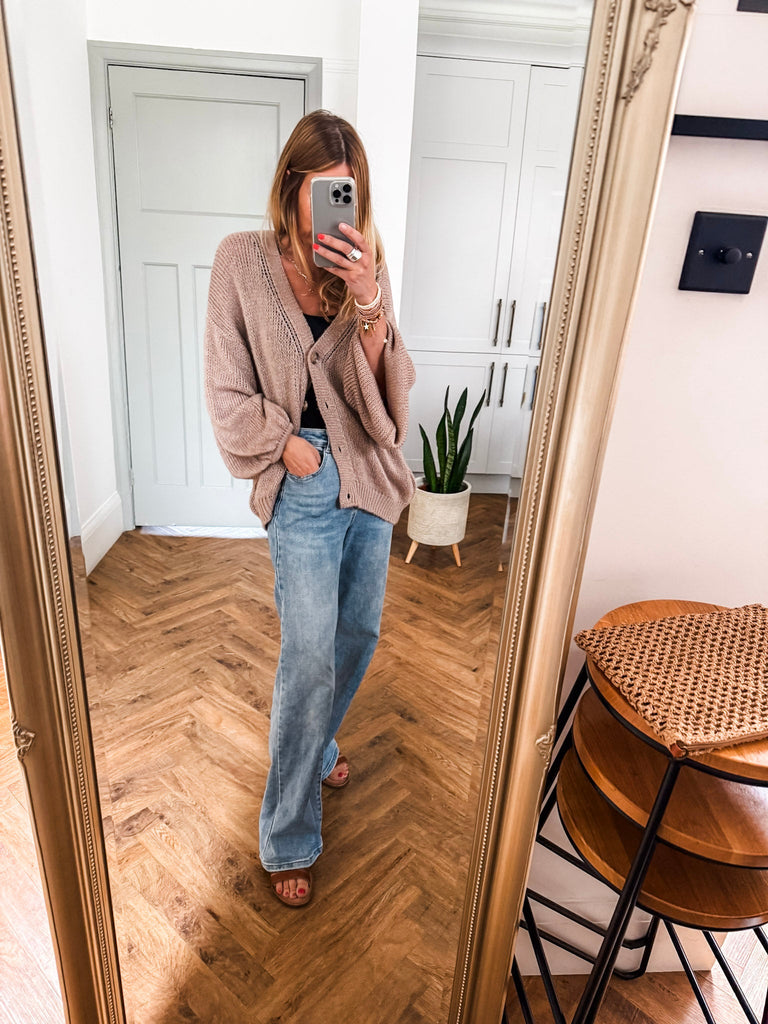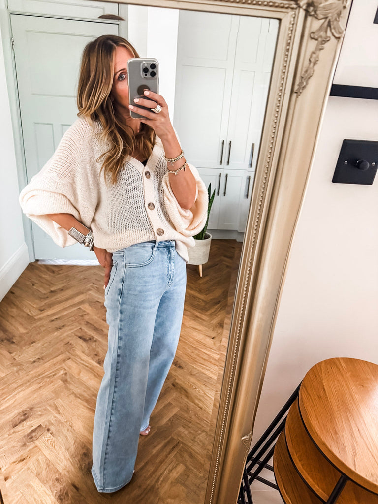 Layer the Balloon Sleeve Button Cardigan over a fitted tank and wide-leg jeans for a relaxed, on-trend look. Wear it buttoned up with a midi skirt and boots for an elevated everyday outfit. Add bold earrings or a structured bag to complete the vibe.