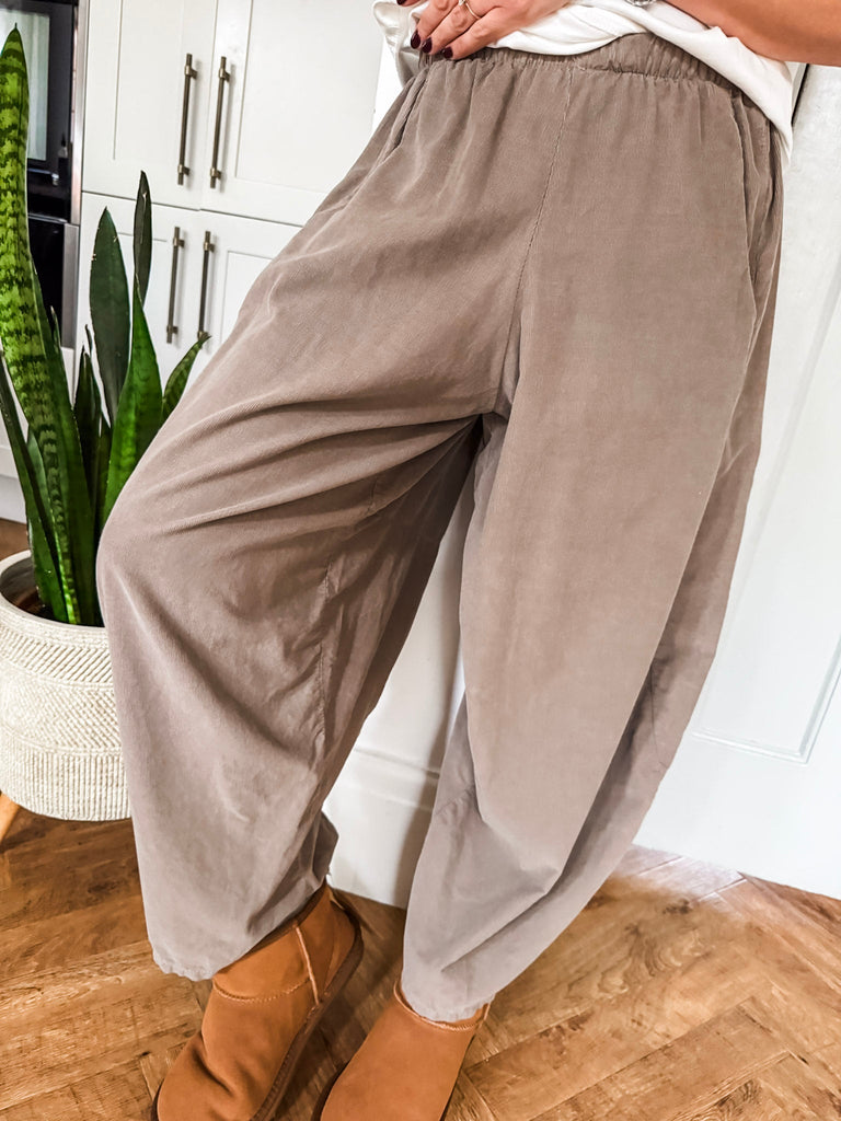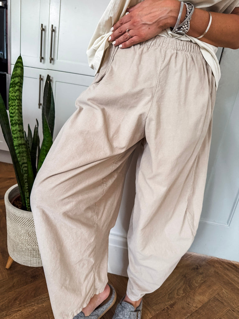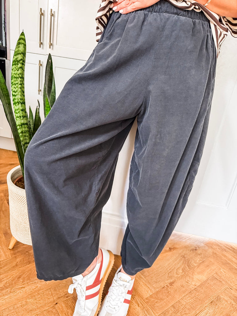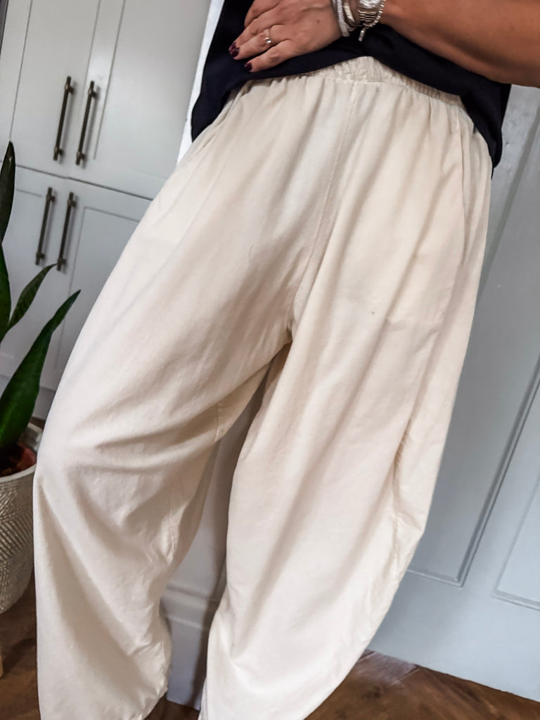 If you love our Balloon trousers you'll love these! Dress your style with our Cord Balloon Trousers, crafted from 100% cotton for ultimate comfort. Featuring an elasticated waist and practical pockets, these wide-leg trousers blend functionality with flair. Upgrade your wardrobe with this versatile essential that adds a cool touch to any outfit.