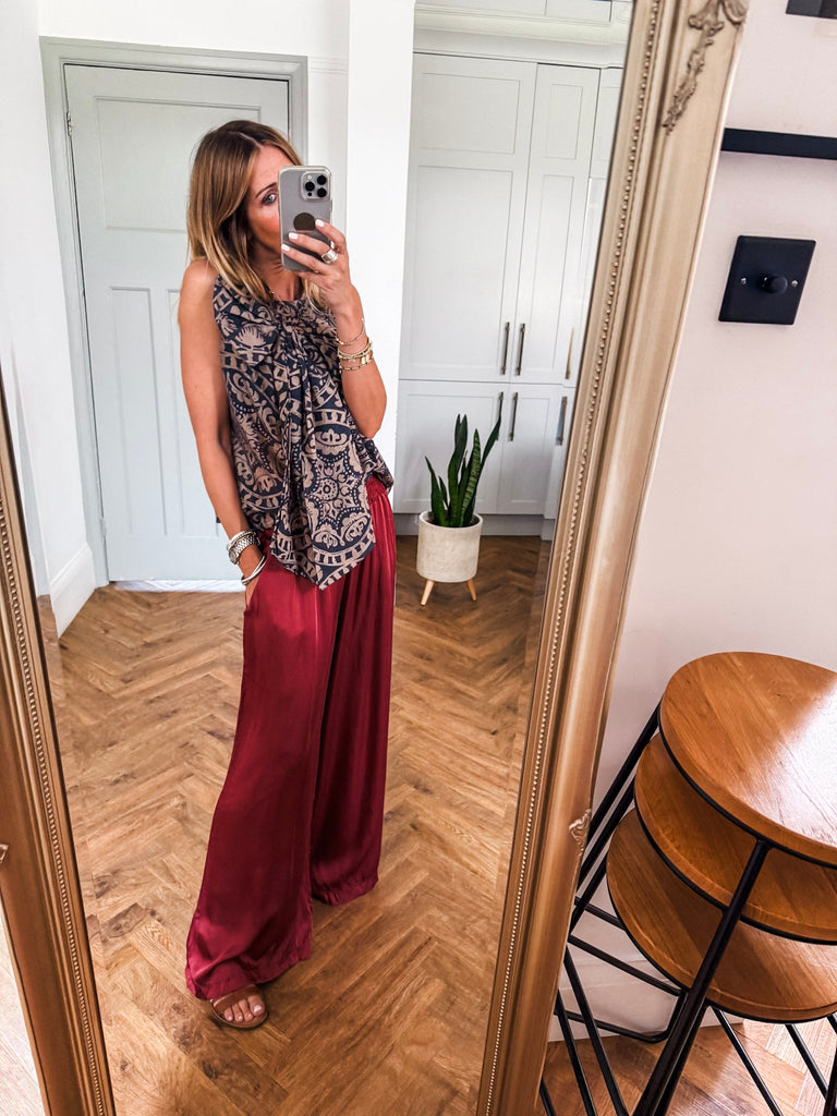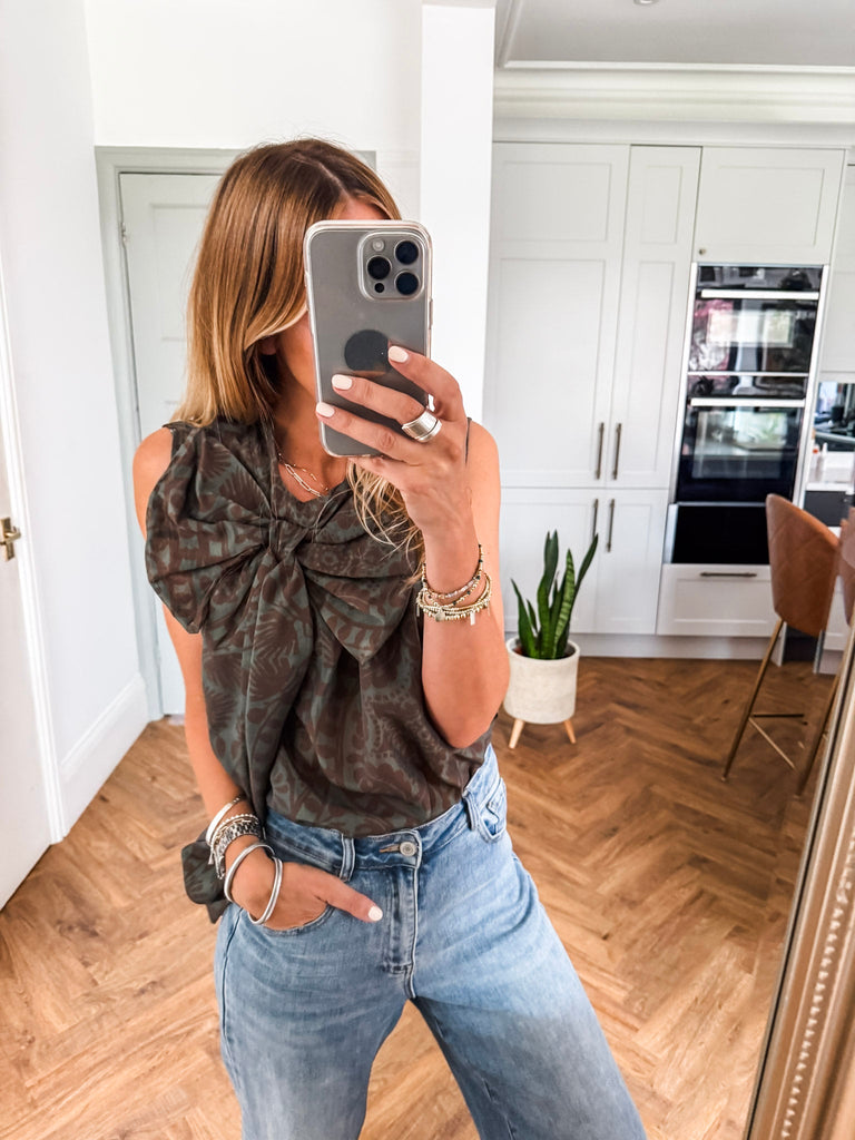 Embrace effortless style with this sleeveless blouse featuring a relaxed A-line silhouette that flatters every figure. Designed with an all-over floral and tribal-inspired print, it brings a touch of bohemian charm to your wardrobe. The high neckline is elegantly finished with a statement bow detail at the front, adding a soft, feminine touch. Crafted from lightweight fabric, this blouse is perfect for warm days or easy layering. Finished with a subtle button closure at the back for a polished look.