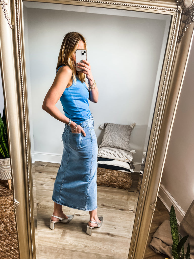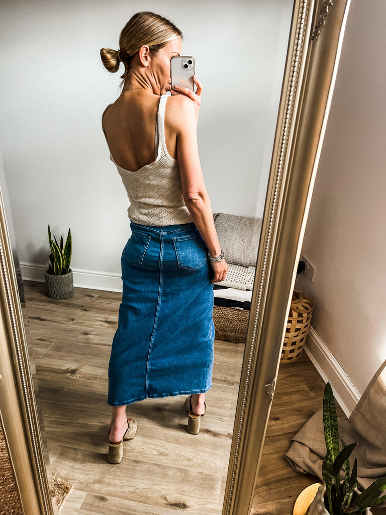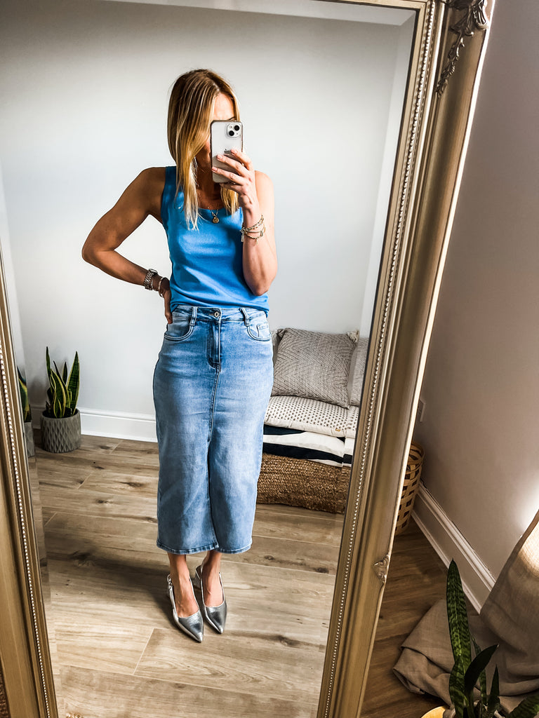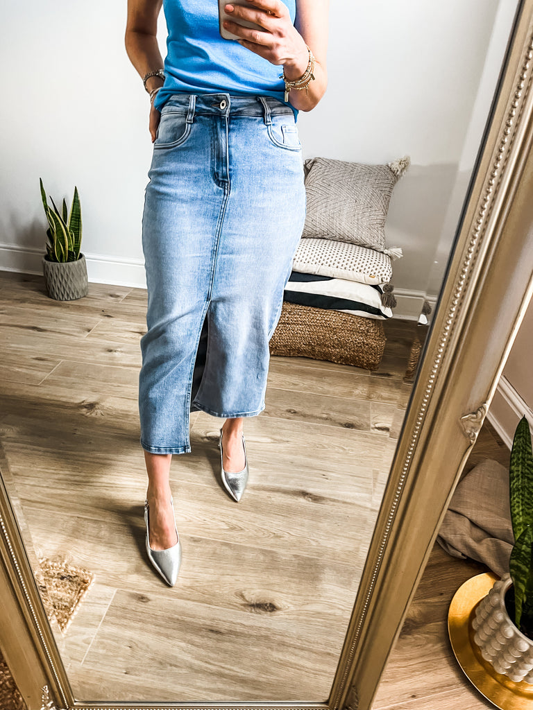 This versatile high-waist denim midi skirt can be styled in countless ways. Pair it with a white t-shirt and trainers for a casual daytime look or dress it up with a blouse and heels for a night out. Add a denim jacket for an effortlessly chic double-denim outfit.