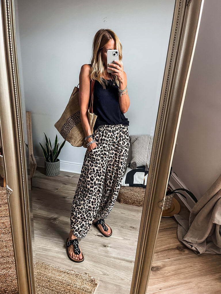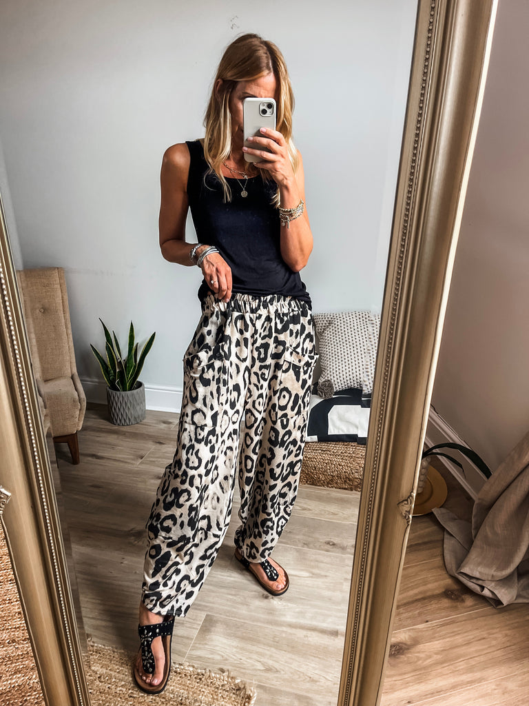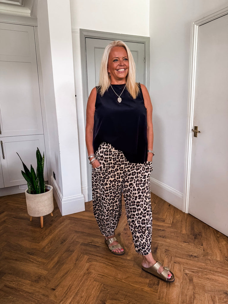 Style the Leopard Print Balloon Trousers with a fitted black turtleneck, a simple white vest top or t-shirt for a balanced look. Complete the outfit with sleek ankle boots or chunky trainers and minimal accessories to let the trousers take center stage. For added flair, throw on a tailored to match leopard print jacket or denim jacket.
